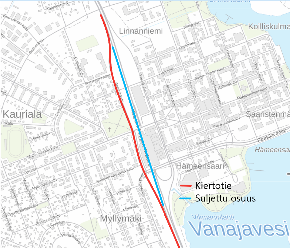 För södergående trafik kan tunneln kringgås via Eureninkatu och för norrgående trafik via Kaivokatu.