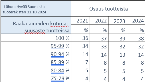 Hyvää Suomesta -merkityistä tuotteista raaka-aineeltaan 100 prosenttisesti kotimaisia on 38 %. Tällaisia tuotteita ovat liha, kala, maito ja munat sekä kaikki yhden aineisosan tuotteet, olipa tuoteryhmä mikä tahansa. Täyteen 100 % yltää myös monia usean aineisosan kasvituotteita kuten vihannessekoituksia ja juomia.