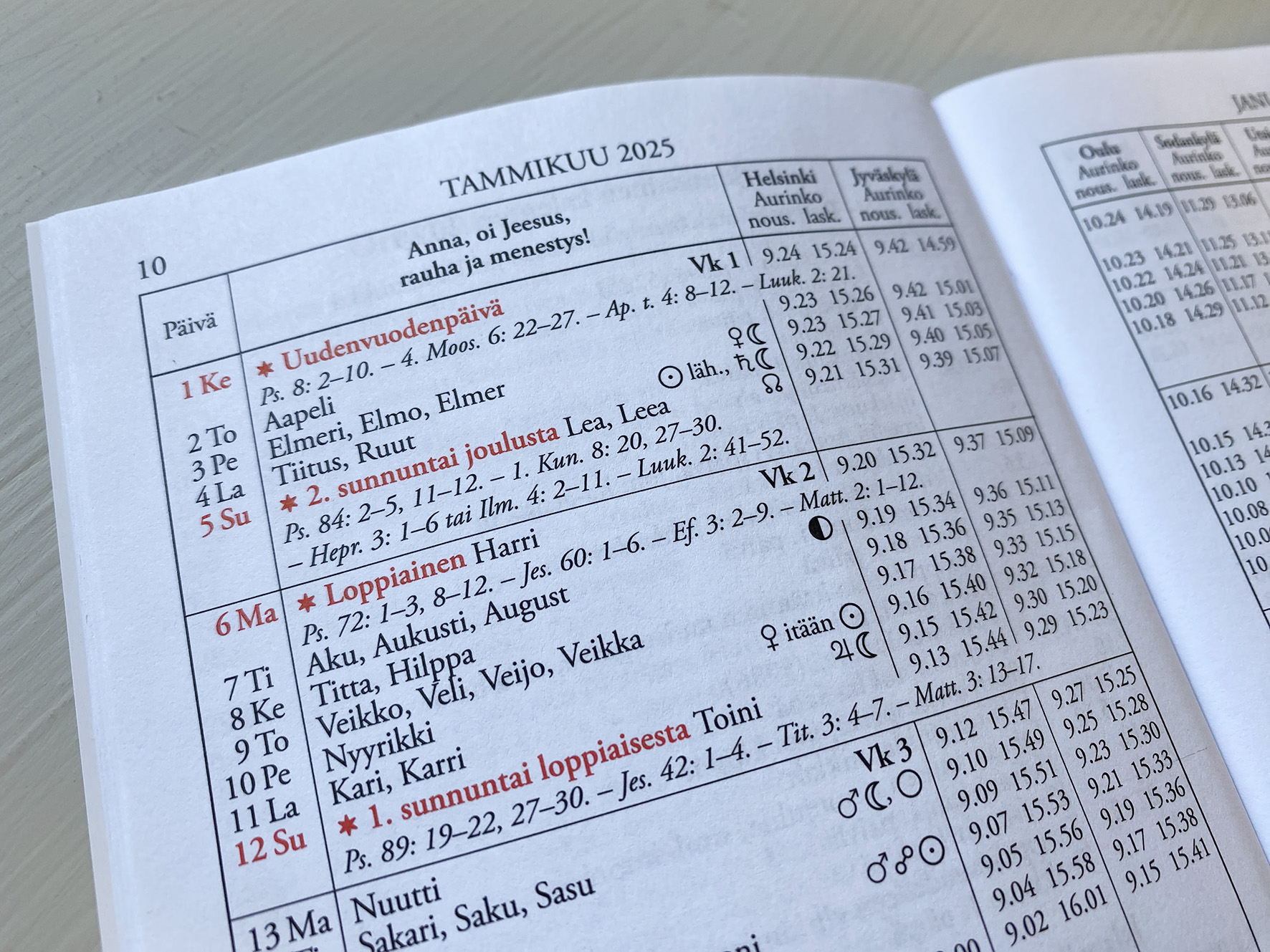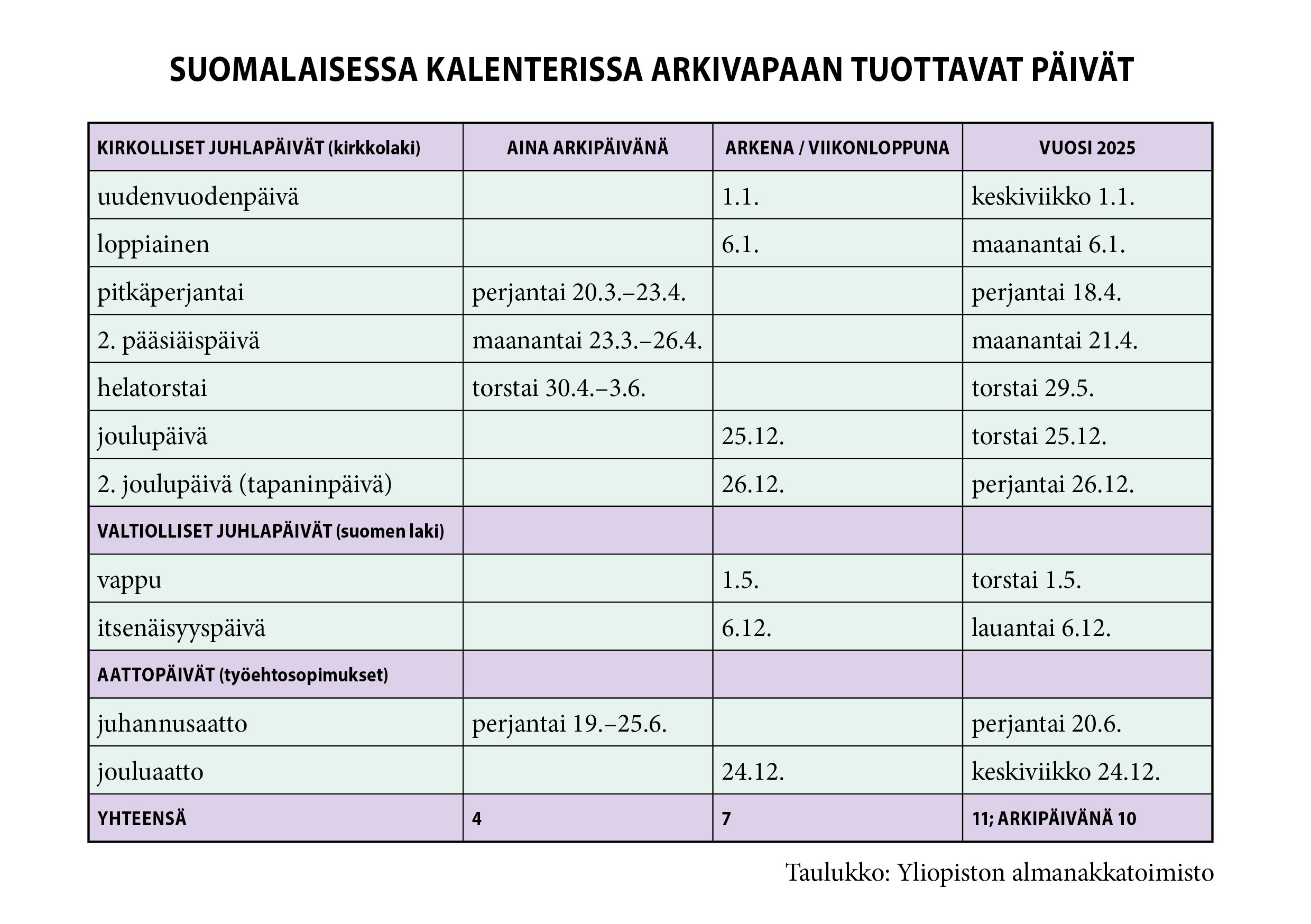 – Kalenterimme viikkojaon vuoksi kaikki yksitoista mahdollista arkipyhää eivät koskaan satu samana vuonna arkipäivälle. Tavallisina vuosina arkivapaita voi olla 7–10 ja karkausvuosina 8–10, selvittää erikoissuunnittelija Asko Palviainen Yliopiston almanakkatoimistosta.
