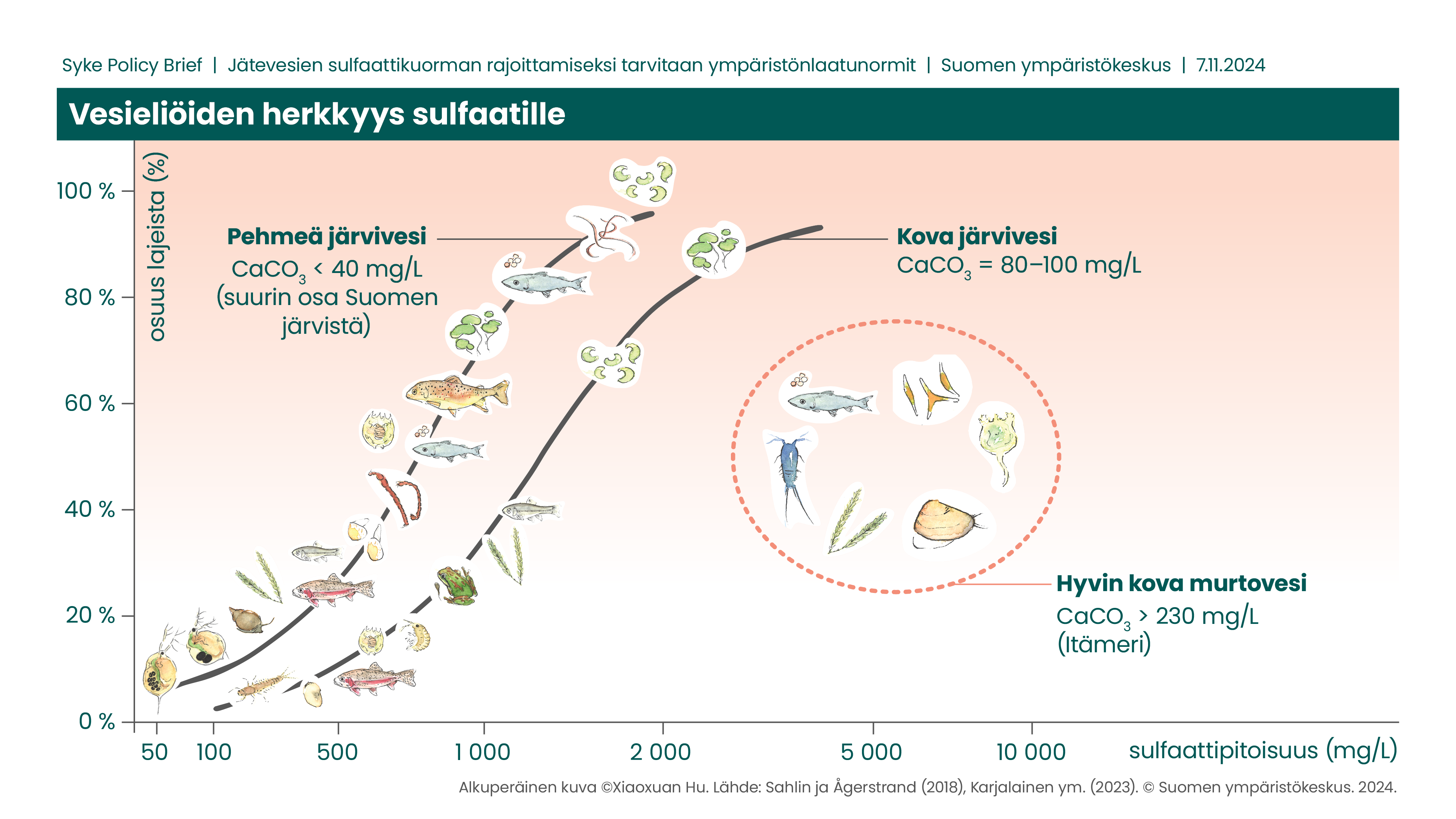 Sulfaatin eliöille haitatonta pitoisuutta on tutkittu Jyväskylän yliopiston ja Syken tutkimuksissa. "Myrkyllisyystestien perusteella korkeat sulfaattipitoisuudet aiheuttavat haittoja erityisesti järvissä, joissa on luonnostaan niukasti sulfaattia. Suolaisuuteen sopeutuneet Itämeren eliöt näyttävät sietävän paljon korkeampia sulfaattipitoisuuksia kuin järvien eliöt", kertoo erikoistutkija Matti Leppänen Sykestä.