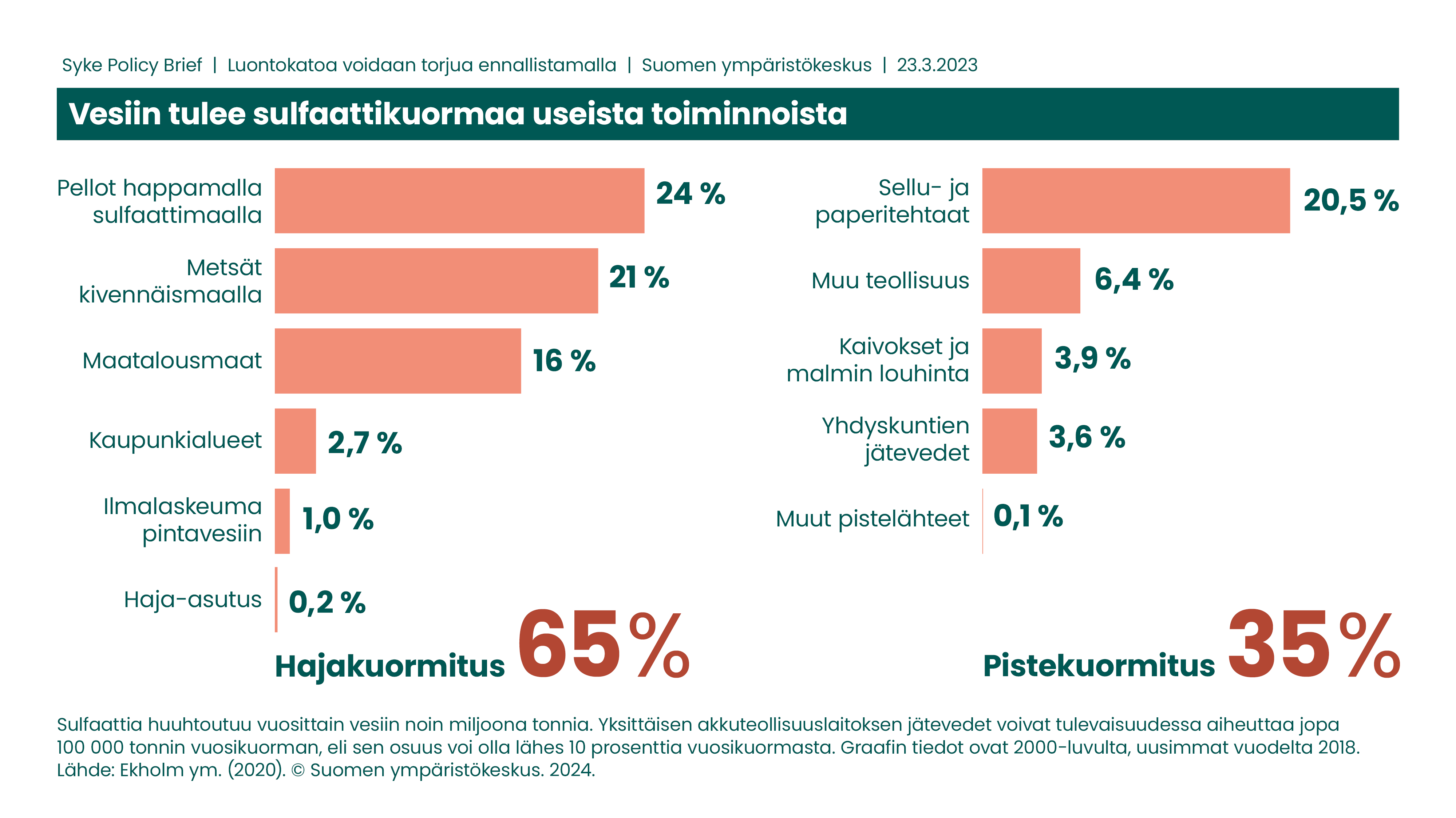 Siirtyminen puhtaaseen energiaan ja vihreä siirtymä ovat tuomassa Suomeen kaivostoimintaa ja akkuteknologiateollisuutta. Tämän seurauksena jätevesien sulfaattikuorma sisävesiin ja Itämereen kasvaa. Sulfaatilla on vesistöissä myös hyödyllisiä vaikutuksia, eikä sulfaattia nykyisin luokitella haitalliseksi aineeksi. Suuri paikallinen kuorma voi kuitenkin vaikuttaa haitallisesti vesieliöstöön etenkin järvissä, joissa sulfaattia on niukasti. Suomen ympäristökeskuksen uusi Policy Brief -julkaisu antaa suosituksia jätevesien sulfaattikuorman haittojen vähentämiseksi.