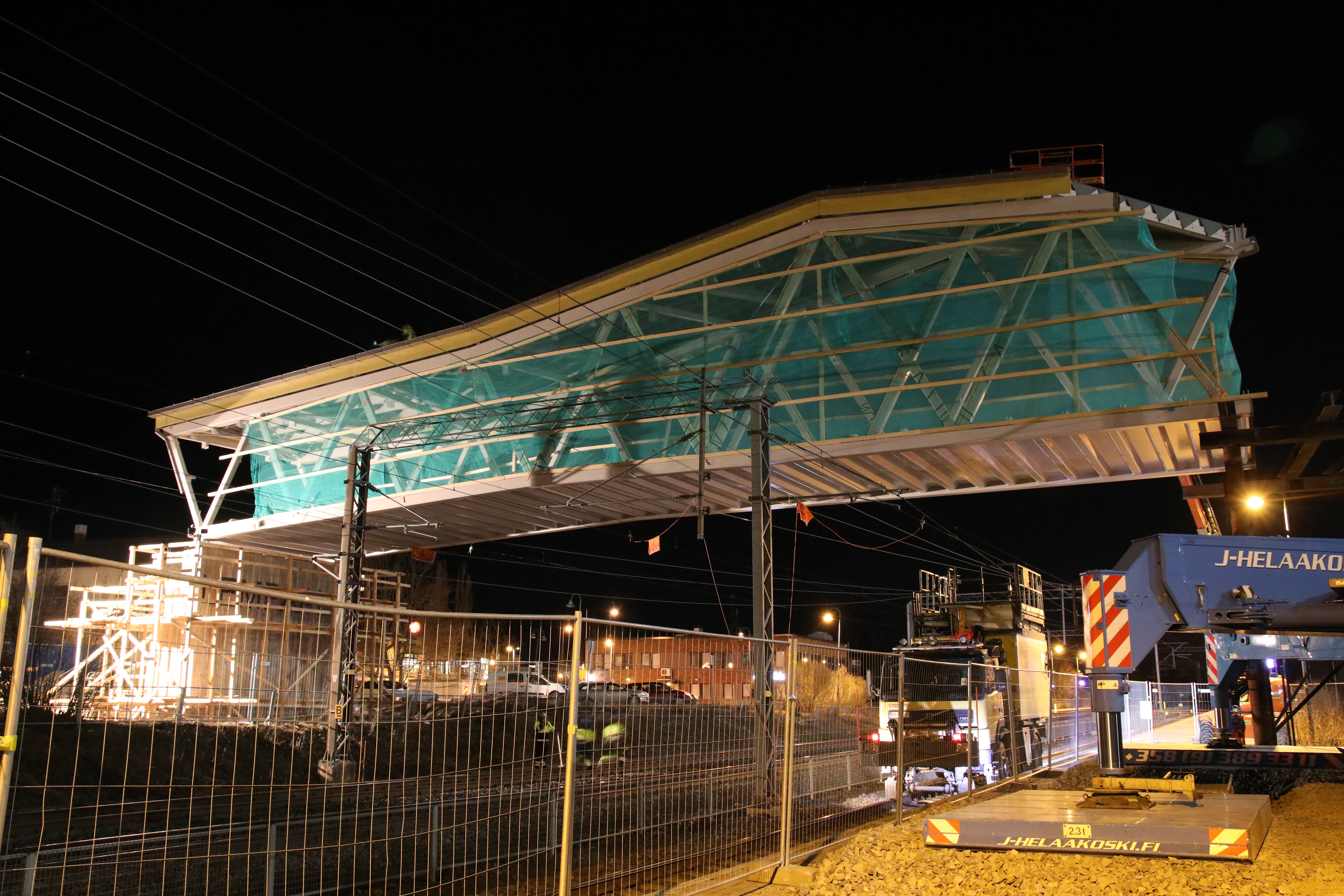 – Yli 65 tonnia painavan ja 30 metriä pitkän siltalohkon nosto vaati huolellista ennakkosuunnittelua, oikean kaluston sekä ennakkotestausta turvallisuuden ja sujuvuuden takaamiseksi. Työn täytyi onnistua radalle varatun liikenne- ja jännitekatkon aikana, joten teräsrakenne odotti valmiina nosturiin kiinnitettynä radan vieressä h-hetkeä. Onhan se aina hieno onnistuminen, kun nosto onnistuu ja junaliikenne toimi työstä huolimatta täysin häiriöttä, Valjakka kertoo