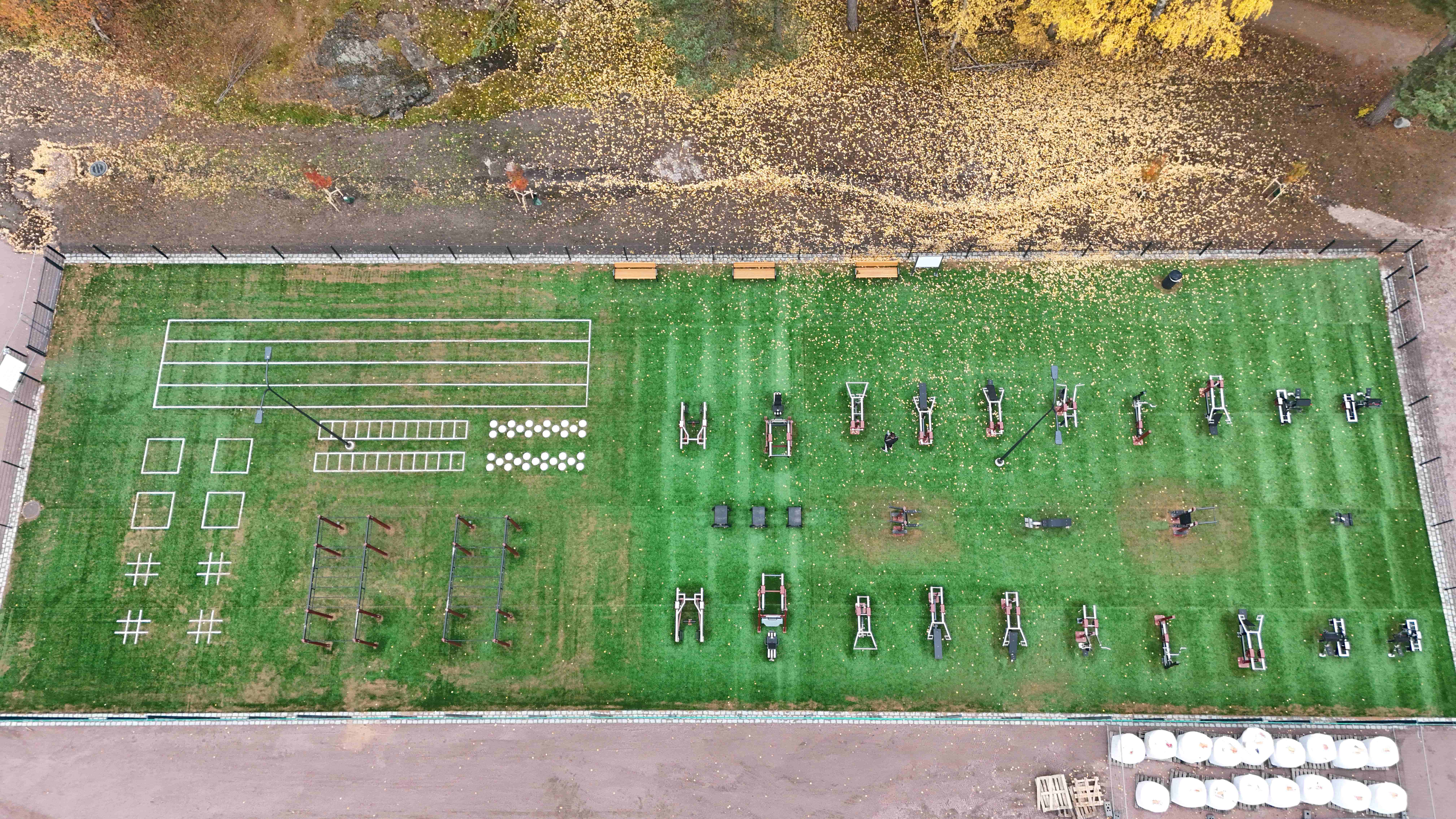 Ilmakuva Mustikkamaan liikuntapuiston ulkokuntosalista.