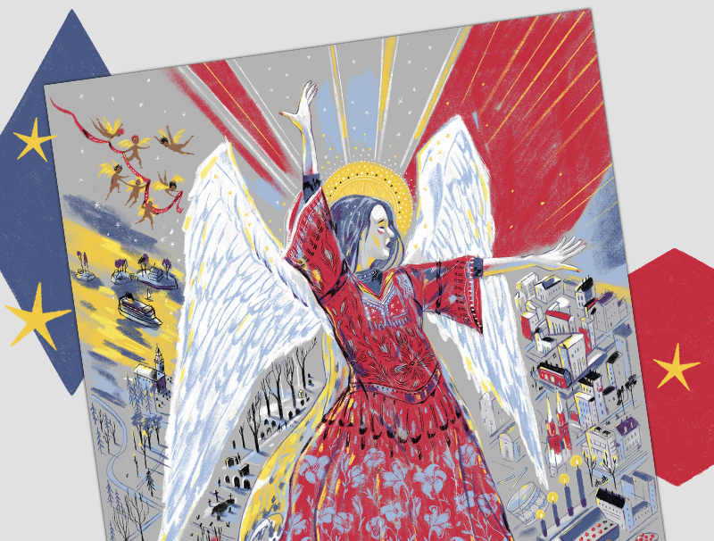 Tänä vuonna joulukalenterin kannessa nähdään persoonallista energiaa hehkuva enkeliteemainen kaupunkikuvitus. Kalenterin ilme on kuvittaja, lastenkirjailija Ilja Karsikkaan kädenjälkeä. Hän kuvitti pääkaupunkiseudun seurakuntien joulukalenterin myös vuonna 2018.