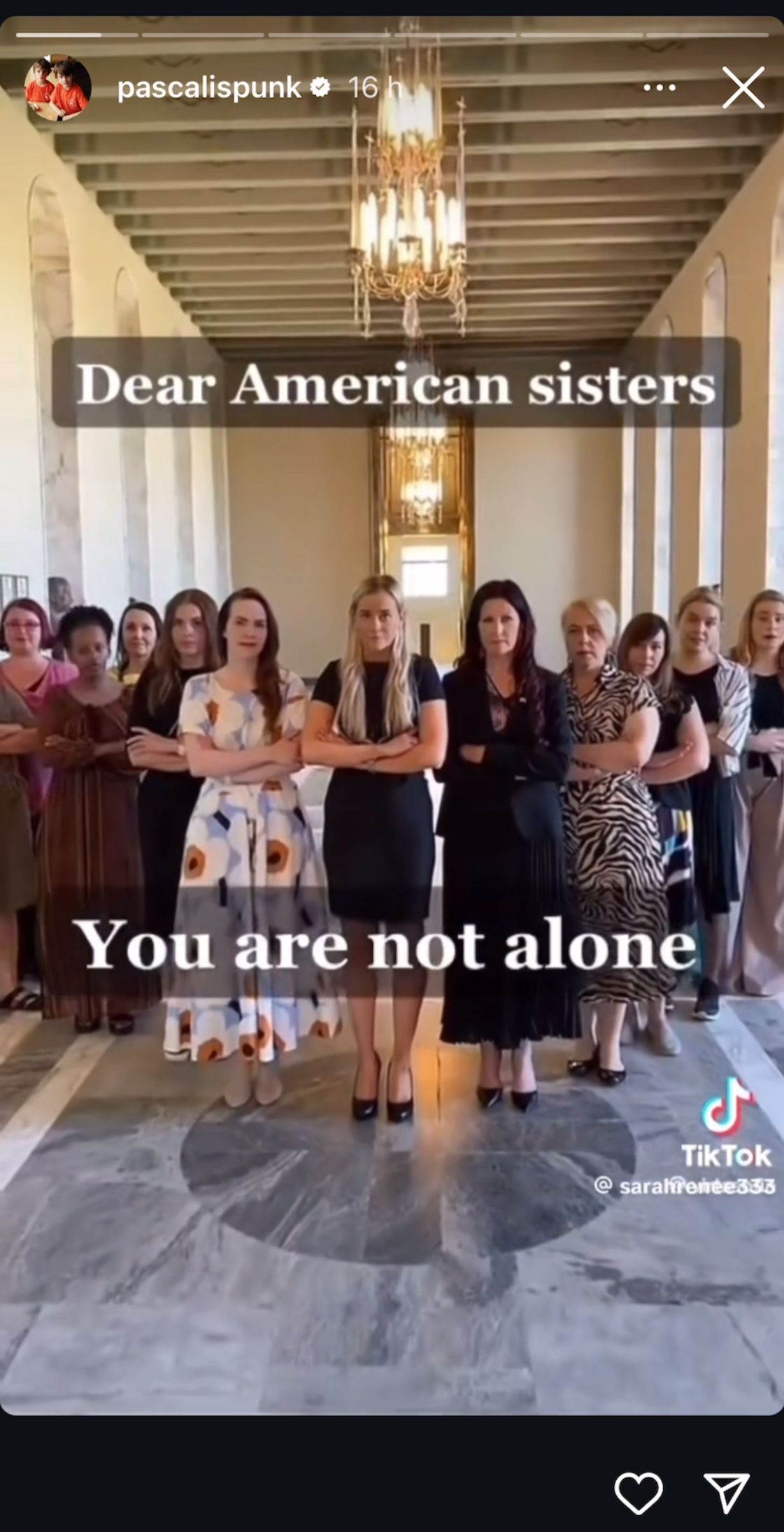 Virran alkuperäisellä TikTok-videolla joukko suomalaisia naiskansanedustajia seisoo rivissä eduskuntatalon valtionsalissa tuimin ilmein ja videossa on teksti: “Dear American Sisters, you are not alone.”