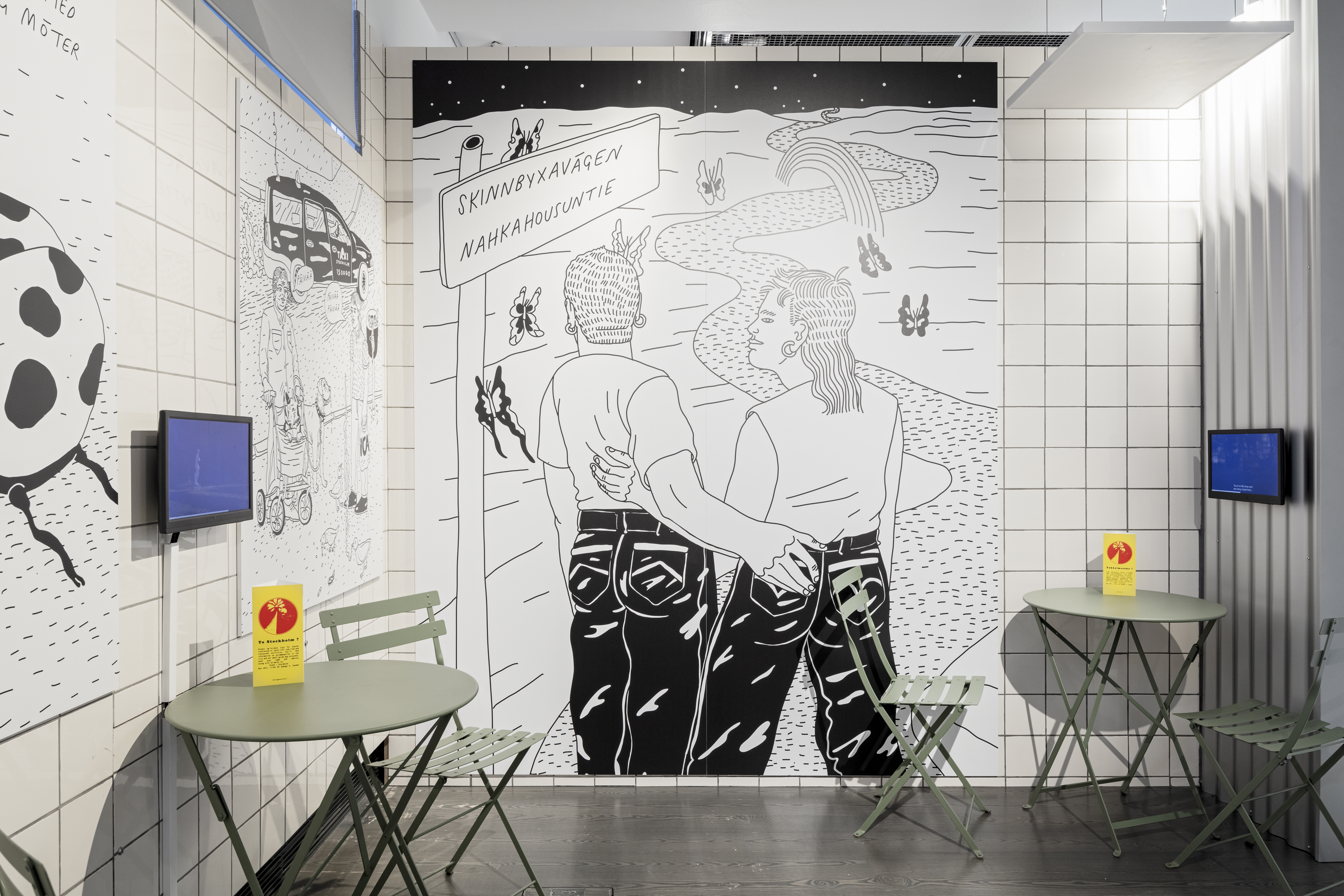 I utställningen finns den finlandssvenska bildkonstnären Edith Hammars teckningar ur seriealbumet Homo Line.