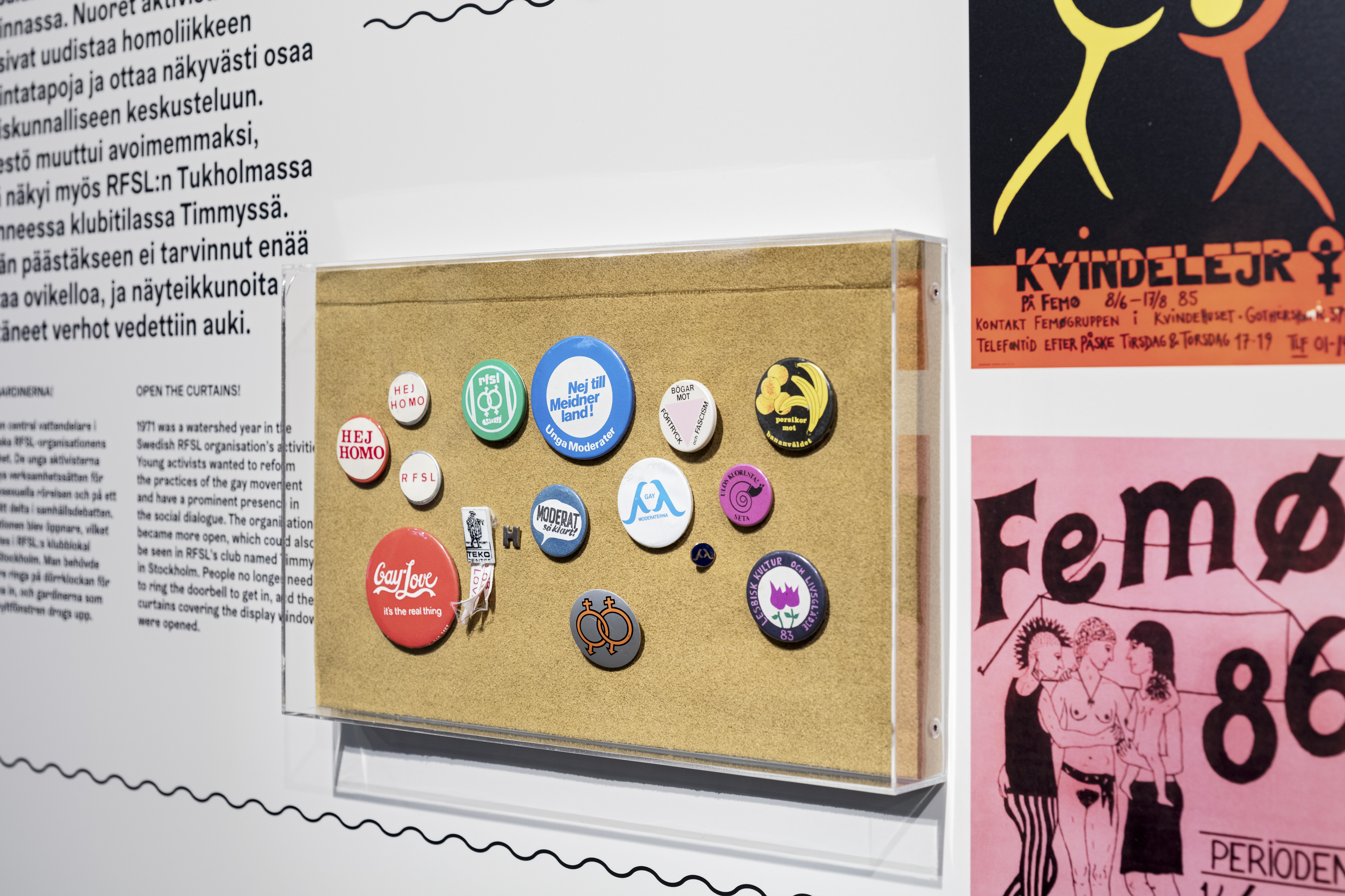 Utställningen innehåller bland annat pins relaterade till aktivism.