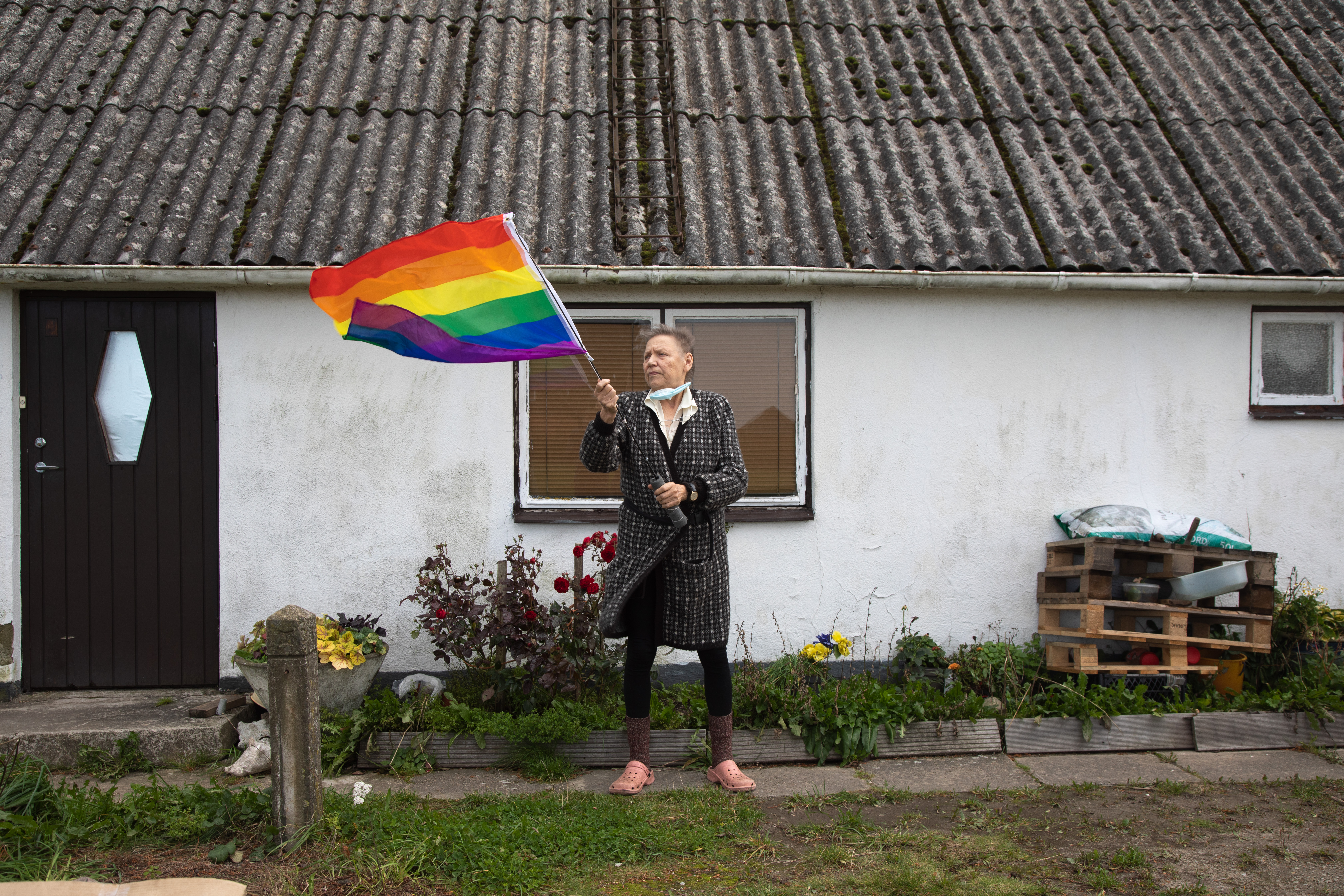 Varför har personer som hör till sexuella minoriteter och könsminoriteter bytt sitt hemland till ett annat? Den här frågan reflekterar man över i den nya utställningen M/S Baltic Queers. På bilden Meeri Liimatainen framför sitt hem i oktober 2023.