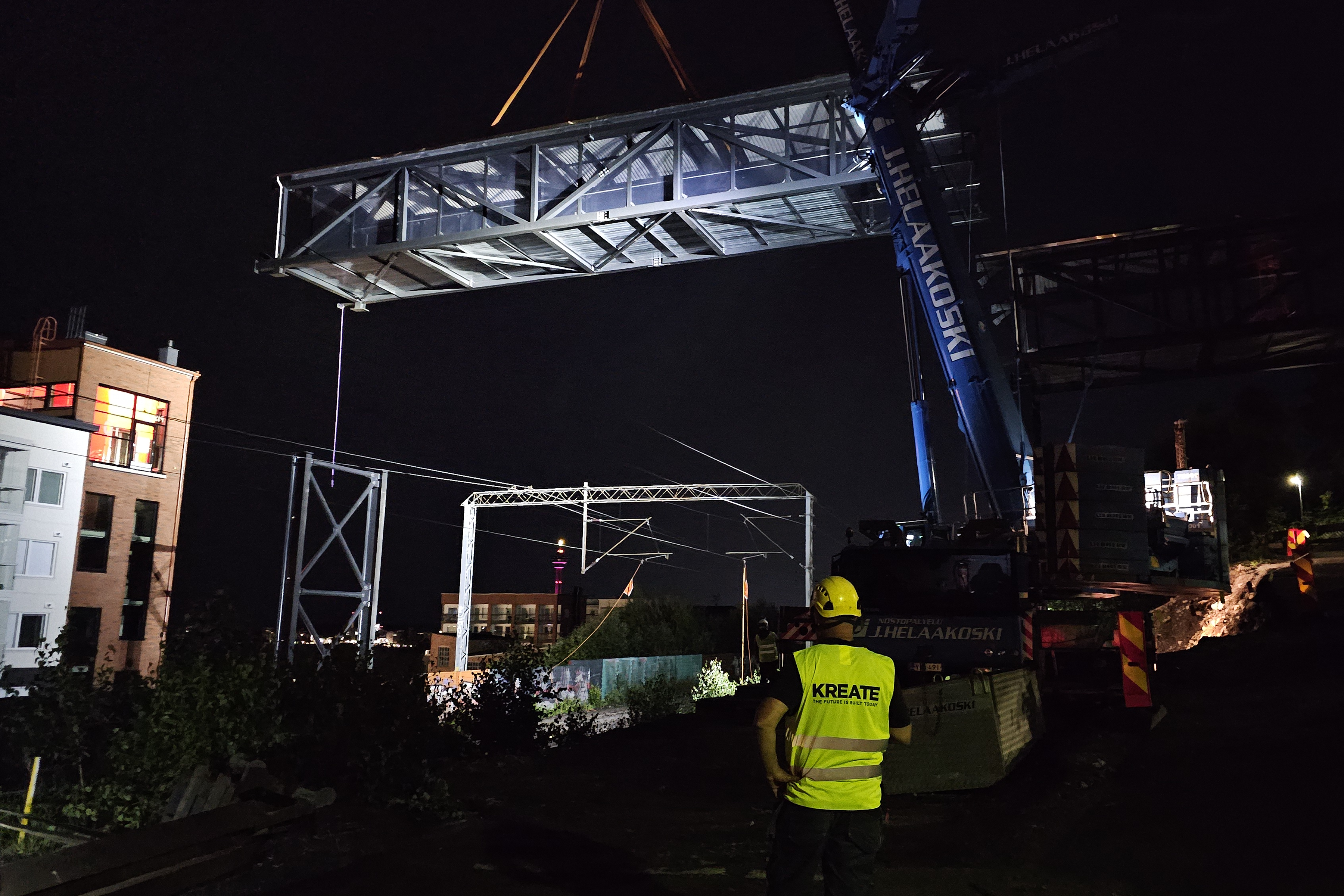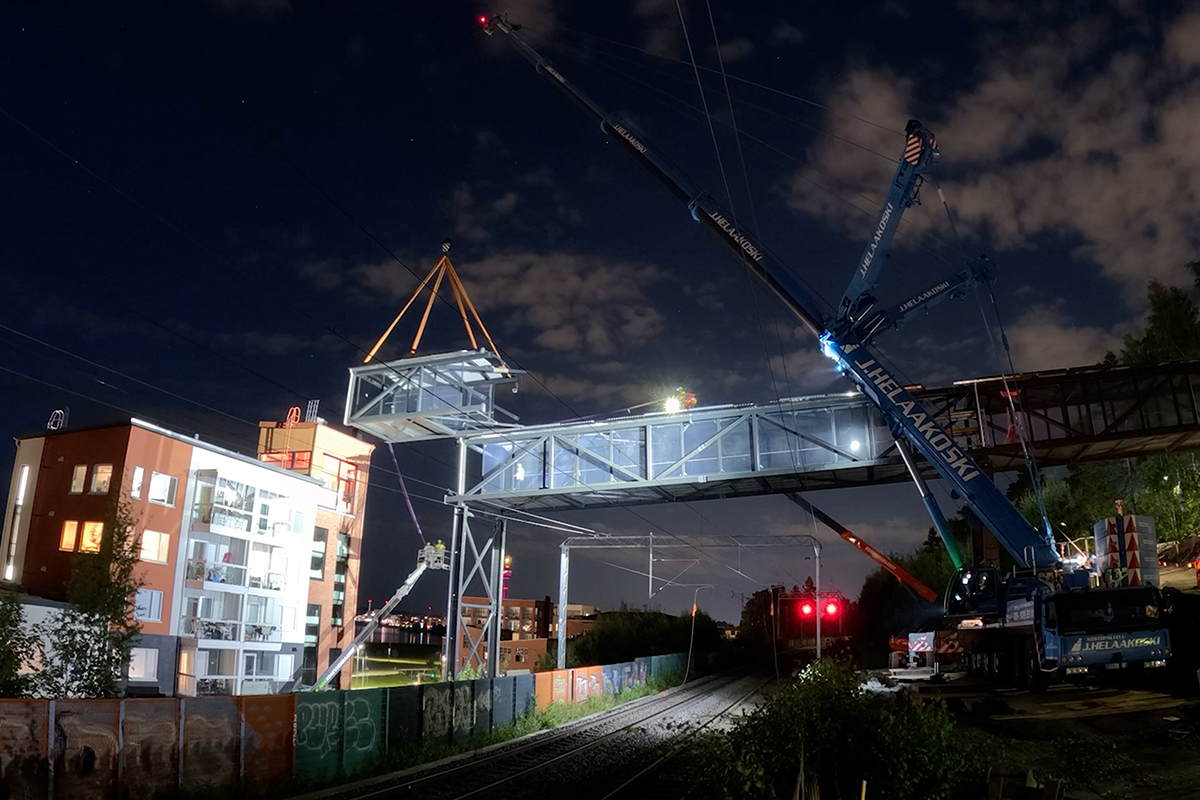– Ylikäytävä on aikaisempaan kiertoreittiin verrattuna esteetön ja sen kautta on mahdollista taluttaa vaikkapa polkupyörä tai potkulauta. Sillan hierretty betonipinta ja siihen asennetut lämmityskaapelit takaavat myös sen, että siltakansi ei tule liukkaaksi, kertoo kohteen työmaapäällikkö Mika Haimila Kreatelta.
