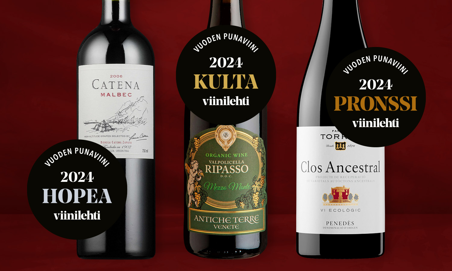 Vuoden punaviiniksi valikoitui vivahteikkaan monipuolinen, herkullisen marjainen ja mausteinen Antiche Terre Ripasso Mezzo Monte Organic vuodelta 2020. Viinin laadukkuudesta ja luonteikkuudesta kertoo se, että Viinilehti valitsi sen tänä vuonna myös Vuoden luomupunaviiniksi. Nyt sen kaulaan pujotetaan toinen kultamitali. Hopealle tuli täyteläisen mehevä, tummasävytteisen marjainen malbec Catena Zapatalta. Pronssisijalle päätyi espanjalaisen Familia Torresin kirsikkainen, kukkainen ja hennon mausteinen Clos Ancestral.