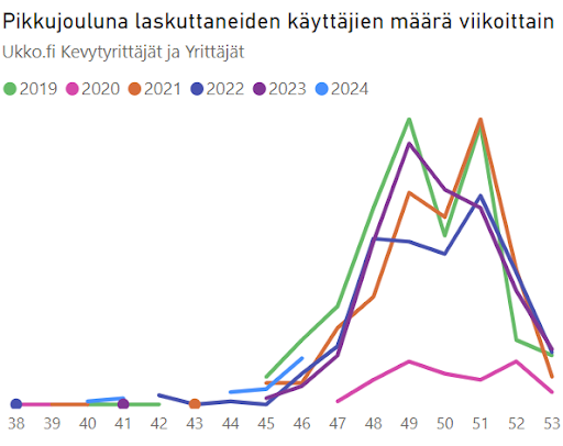 – Tähän mennessä kertyneet laskutustiedot tältä vuodelta vaikuttaisivat siltä, että tänä vuonna olemme saavuttamassa koronaa edeltävän tason pikkujouluihin liittyvissä laskutusmäärissä. Laskujen määrä on nyt korkeampi kuin yhtenäkään vuonna koronan jälkeen tähän aikaan. Keskimääräisistä laskutussummista on hauska huomata, että valokuvaajat ovat osanneet nostaa hintojaan vuosien varrella, kertoo analyytikko Petteri Kaikkonen UKKO.fi:ltä.