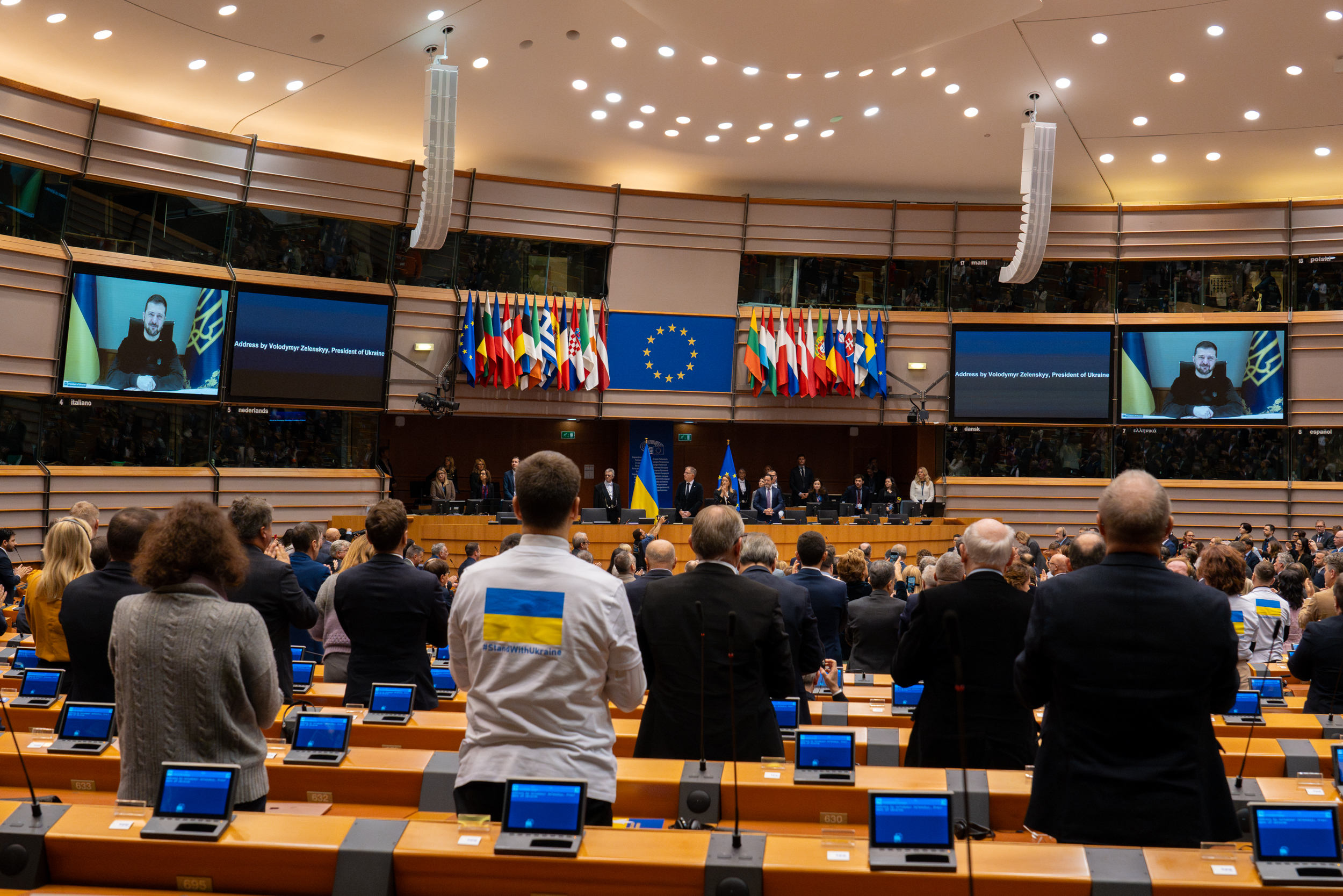Puheessaan Ukrainan presidentti Volodymyr Zelenskyi kiitti EU:ta sen jatkuvasta tuesta ja sanoi, että Ukraina on yhdessä eurooppalaisten, amerikkalaisten ja muiden kumppaniensa kanssa onnistunut estämään Putinia valtaamasta Ukrainaa ja puolustamaan kaikkien Euroopan valtioiden vapautta. ”Putin on pienempi kuin Euroopan yhteenlaskettu voima. Älkää unohtako tätä faktaa, älkääkä sitä, miten paljon Eurooppa voi saada aikaan. Me voimme painostaa Venäjää kohti oikeudenmukaista rauhaa. Rauhaa me haluamme kaikkein eniten”, sanoi Zelenskyi.