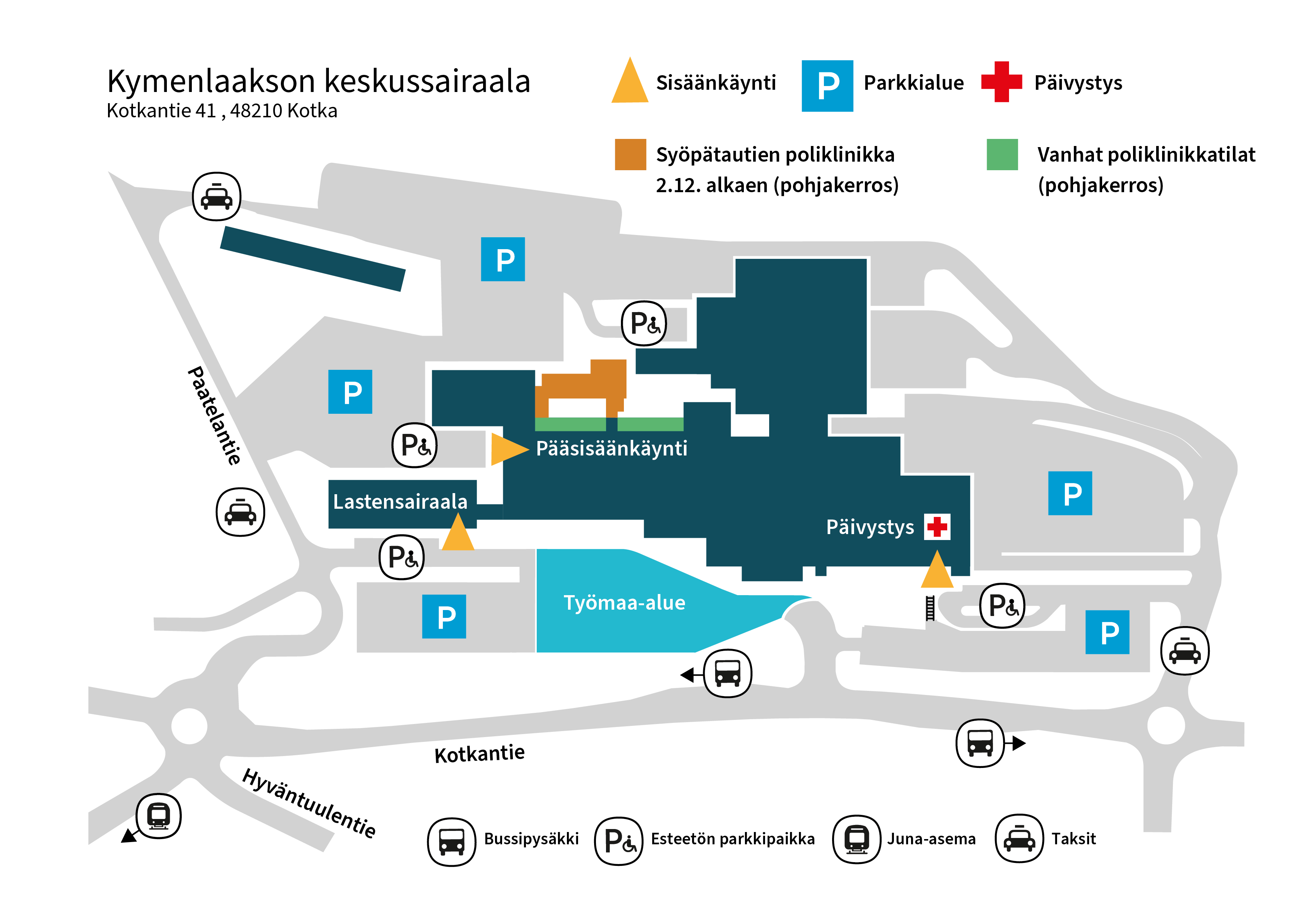 Kulkeminen syöpätautien poliklinikalle ei muutu, vaan vastaanotolle kuljetaan entiseen tapaan sairaalan eteläpäädyssä sijaitsevasta pääsisäänkäynnistä. Ennen vastaanotolle tuloa tehdään ilmoittautuminen Kela-korttia käyttäen aulassa sijaitsevalla ilmoittautumisautomaatilla. Tämän jälkeen kuljetaan portaita pitkin tai hissiä käyttämällä sairaalan pohjakerrokseen. Sisäänkäynti syöpätautien poliklinikan uusiin tiloihin sijaitsee pohjakerroksen hissiaulassa.
