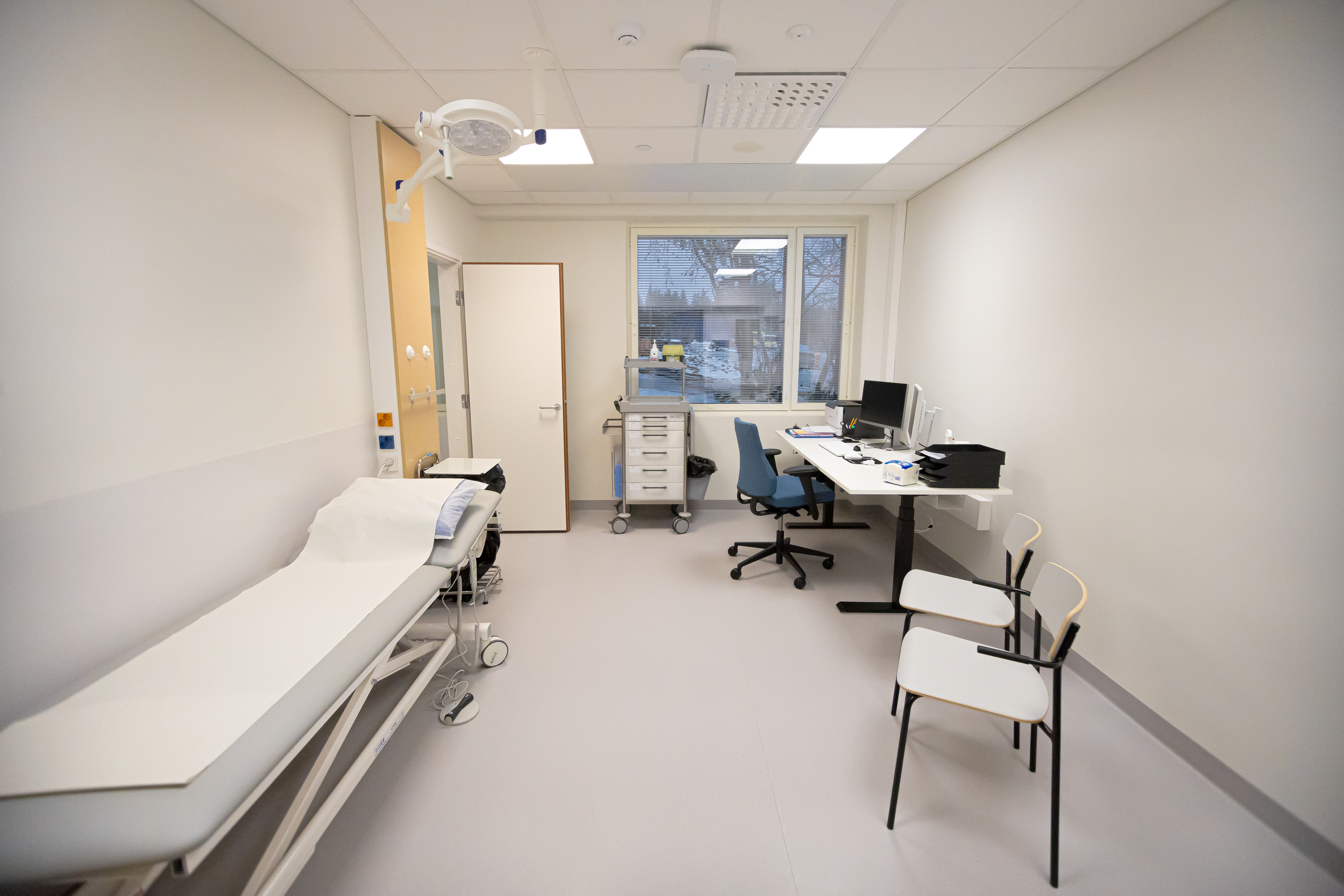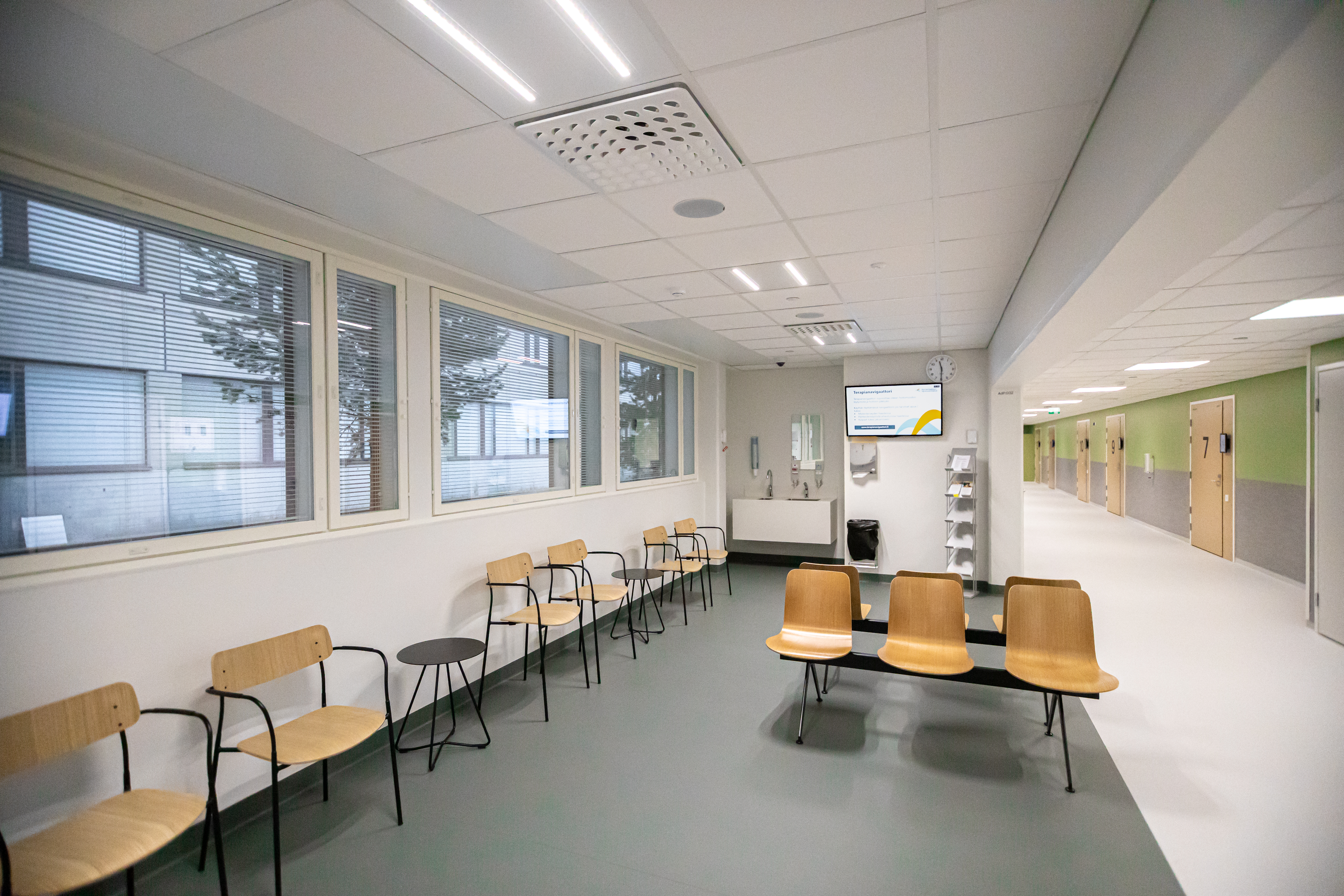 Uudet tilat sijaitsevat lähellä vanhoja tiloja sairaalan pohjakerroksessa. Vastaanotolle kuljetaan entiseen tapaan sairaalan eteläpäädyssä sijaitsevasta pääsisäänkäynnistä.