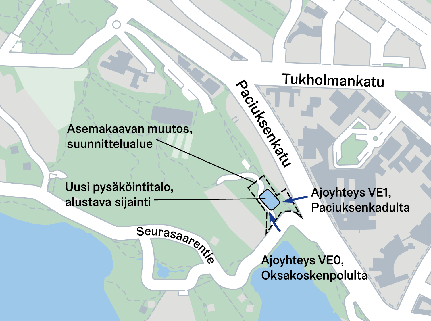 Suunnittelun aikana tutkitaan ajoyhteyksiä pysäköintitaloon. Vaihtoehtoiset ajoyhteydet ovat Paciuksenkadulta tai Seurasaarentieltä. Tavoitteena on, että ajo pysäköintitaloon tapahtuisi Paciuksenkadun puolelta, jolloin se ei lisäisi läpikulkuliikennettä Seurasaarentiellä.