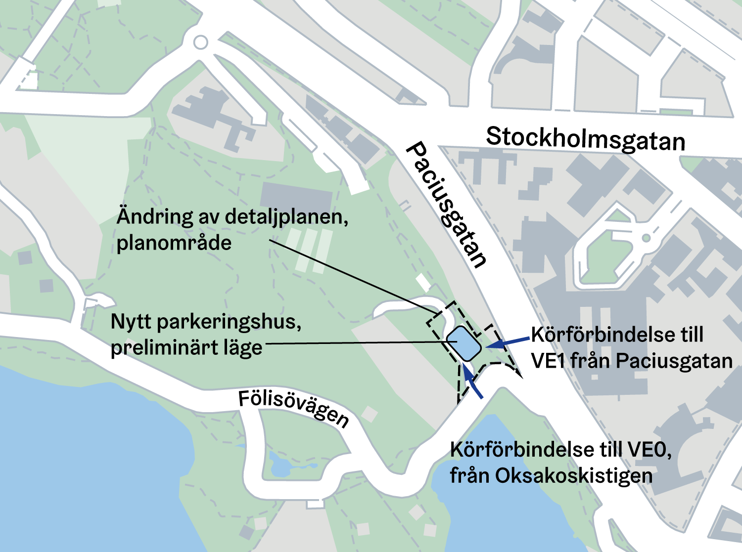 Under planeringen kommer olika körförbindelser till parkeringshuset att undersökas. De alternativa förbindelserna är från Paciusgatan eller Fölisövägen. Avsikten är att tillfarten till parkeringshuset ska gå från Paciusgatan, så att genomfartstrafiken på Fölisövägen inte ökar.