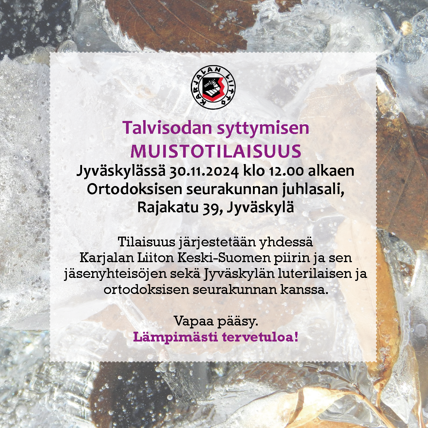 Karjalan Liiton valtakunnallinen talvisodan syttymisen muistotilaisuus pidetään päivätilaisuutena Jyväskylässä lauantaina 30.11.2024 alkaen klo 12.00. Tapahtuman kesto n. 3 h.