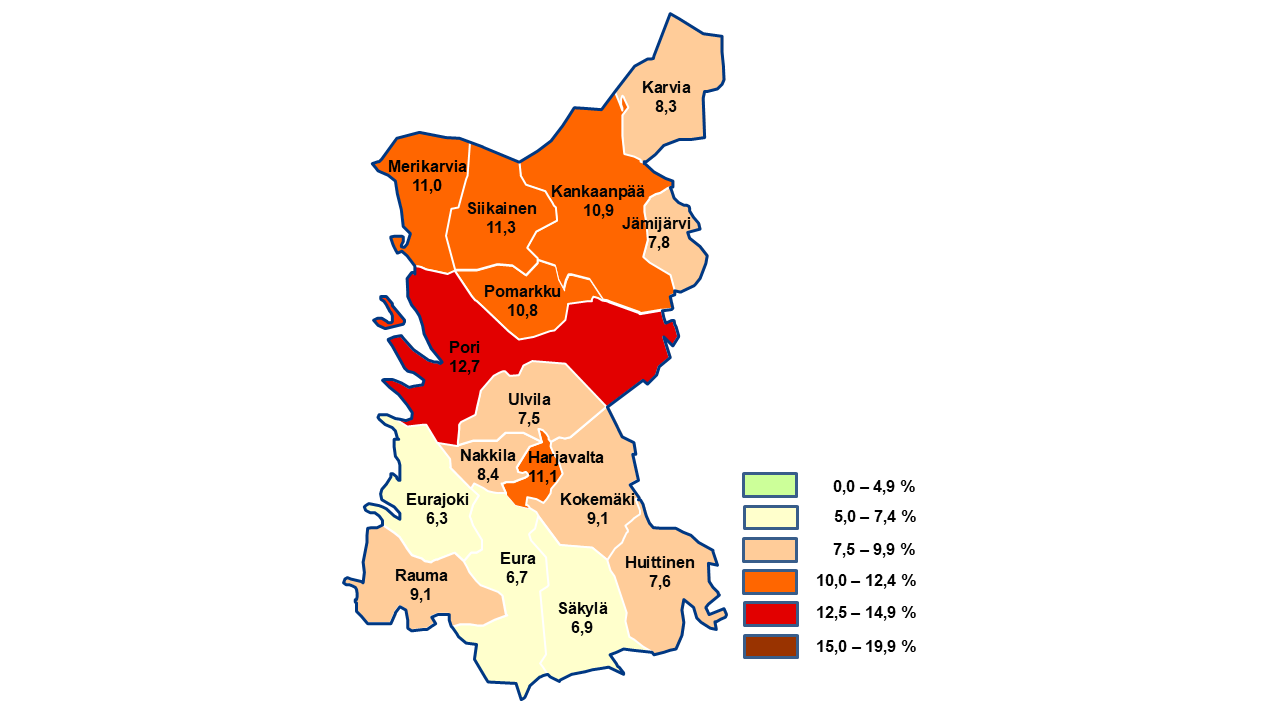Lokakuussa työttömyys oli korkeinta Porissa, jossa työttömien työnhakijoiden osuus työvoimasta oli 12,7 %. Alin työttömyys oli Eurajoella (6,3 %).