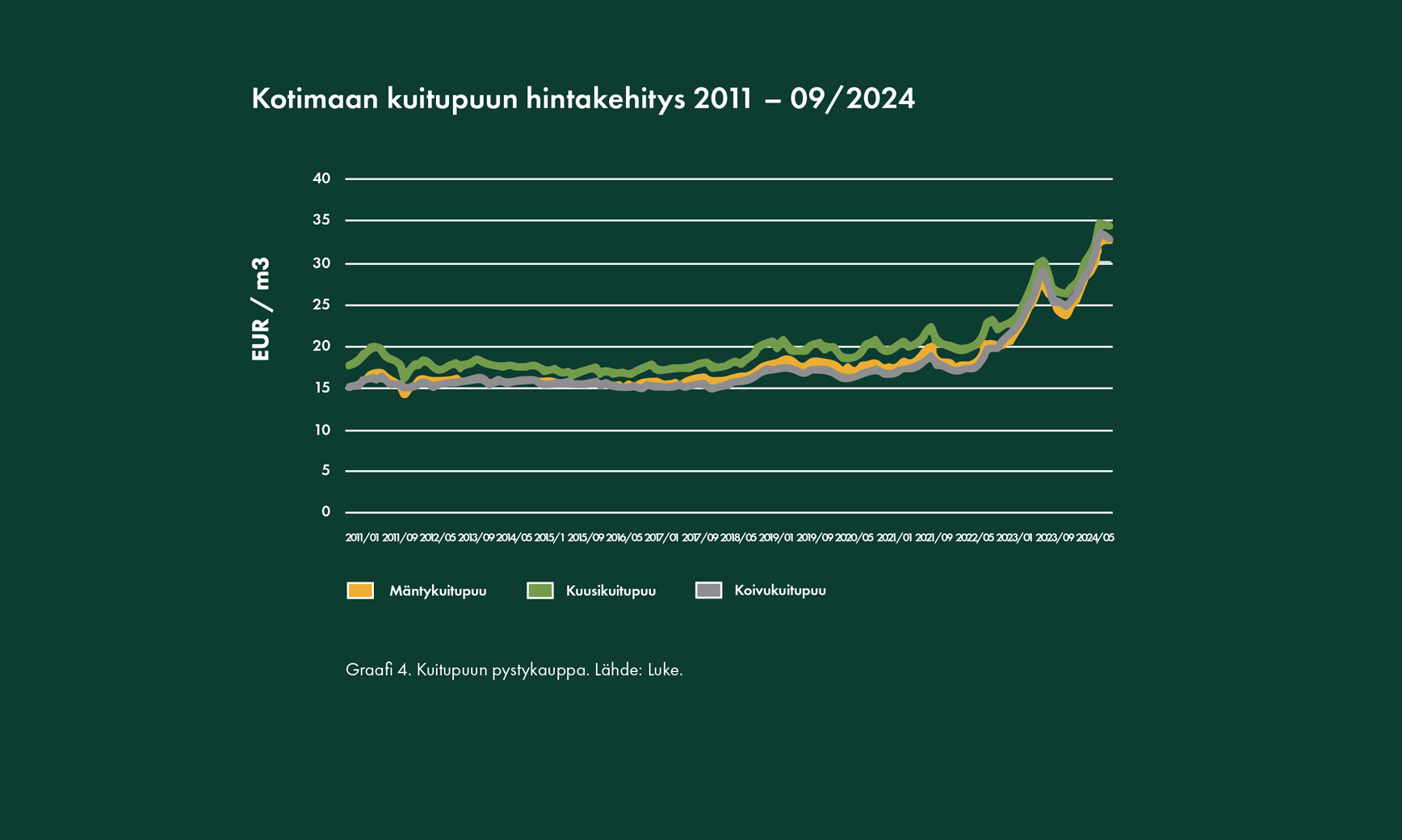 Pohjoismaissa puukaupan tilanne on otollinen metsänomistajan kannalta. Investointivetoinen kysyntä jatkuu ja Metsä Group vihki Kemin biotuotetehtaansa käyttöön koeajojen jälkeen lokakuussa 2024. Puun hinnat ovat korkealla sekä harvennus- että päätehakkuissa. Luonnonvarakeskuksen mukaan puukauppamäärä on kasvanut noin 7 % verrattuna vuoden takaisiin. Venäjän puun poistuminen markkinalta aiheuttaa edelleen niukkuutta tarjonnassa, mikä näkyy erityisesti kuitupuun hinnoissa. Globaalisti tarkasteltuna puun hintakehitys on vahvaa Pohjoismaissa verrattuna muihin maihin.