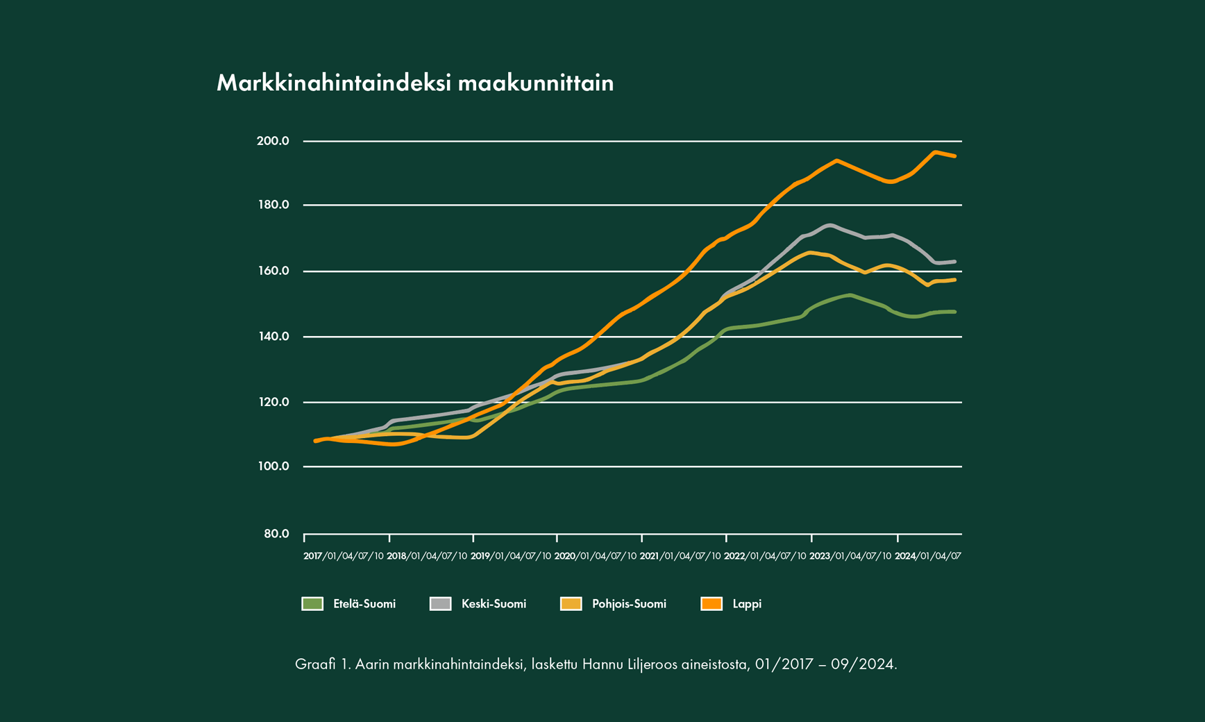 Vuoden 2024 metsätilamarkkinat ovat olleet vaihtelevat. Koko maan metsätilojen hintataso laski hieman vuoden ensimmäisellä puoliskolla (H1 2024), mutta toisella puoliskolla (H2 2024) hintojen lasku tasaantui, paikoin on havaittu pientä elpymistä. Hintakehitys on kuitenkin vaihdellut alueittain. Lapissa ja Etelä-Suomessa hinnat ovat nousseet maltillisesti, kun taas Keski-Suomessa ja Pohjois-Suomessa hinnat ovat laskeneet hehtaarikohtaisesti. Vähentynyt kilpailu metsätiloista näkyy erityisesti Keski- ja Pohjois-Suomessa, joissa metsärahastot ovat olleet aiemmin aktiivisia ostajia.