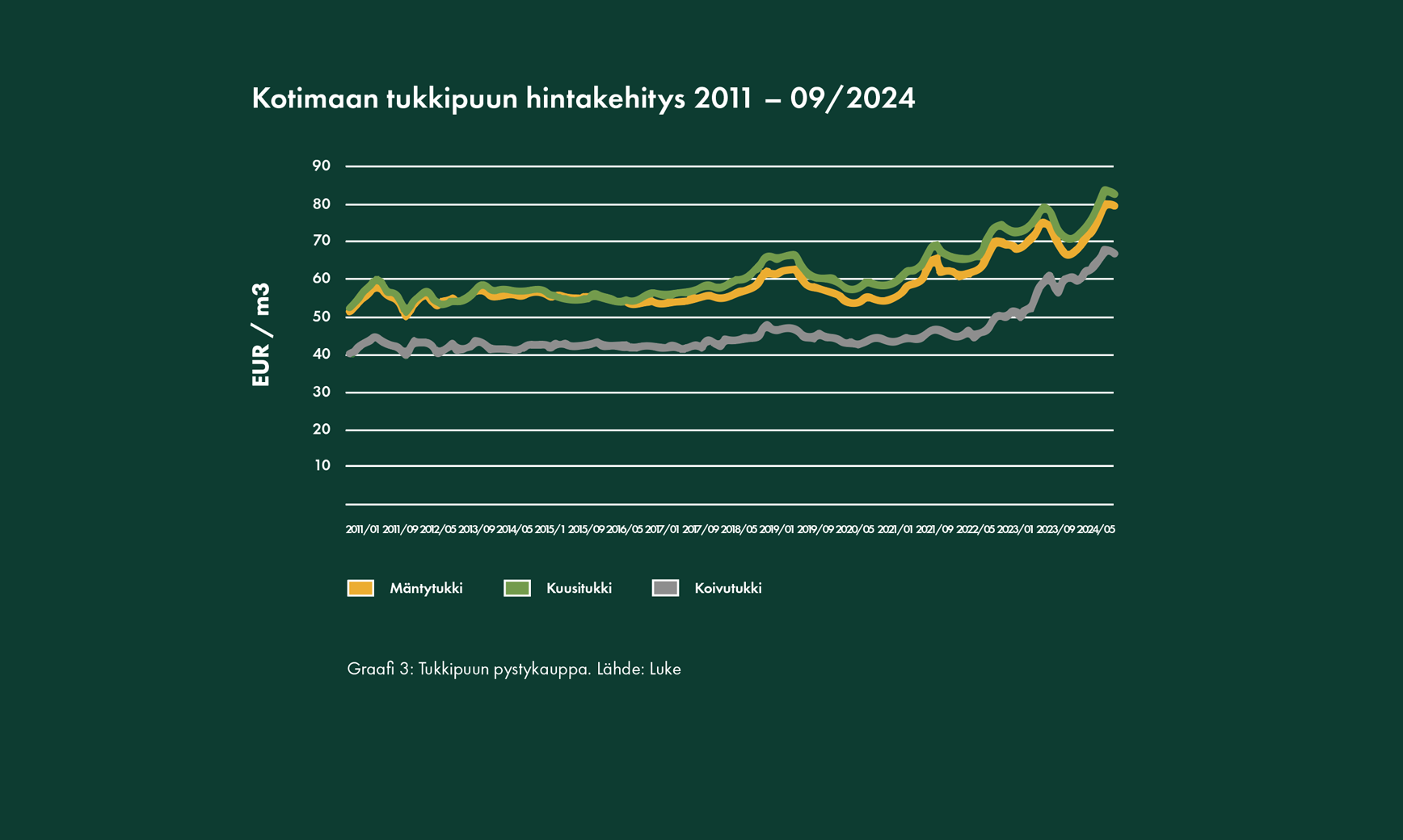Pohjoismaissa puukaupan tilanne on otollinen metsänomistajan kannalta. Investointivetoinen kysyntä jatkuu ja Metsä Group vihki Kemin biotuotetehtaansa käyttöön koeajojen jälkeen lokakuussa 2024. Puun hinnat ovat korkealla sekä harvennus- että päätehakkuissa. Luonnonvarakeskuksen mukaan puukauppamäärä on kasvanut noin 7 % verrattuna vuoden takaisiin. Venäjän puun poistuminen markkinalta aiheuttaa edelleen niukkuutta tarjonnassa, mikä näkyy erityisesti kuitupuun hinnoissa. Globaalisti tarkasteltuna puun hintakehitys on vahvaa Pohjoismaissa verrattuna muihin maihin.