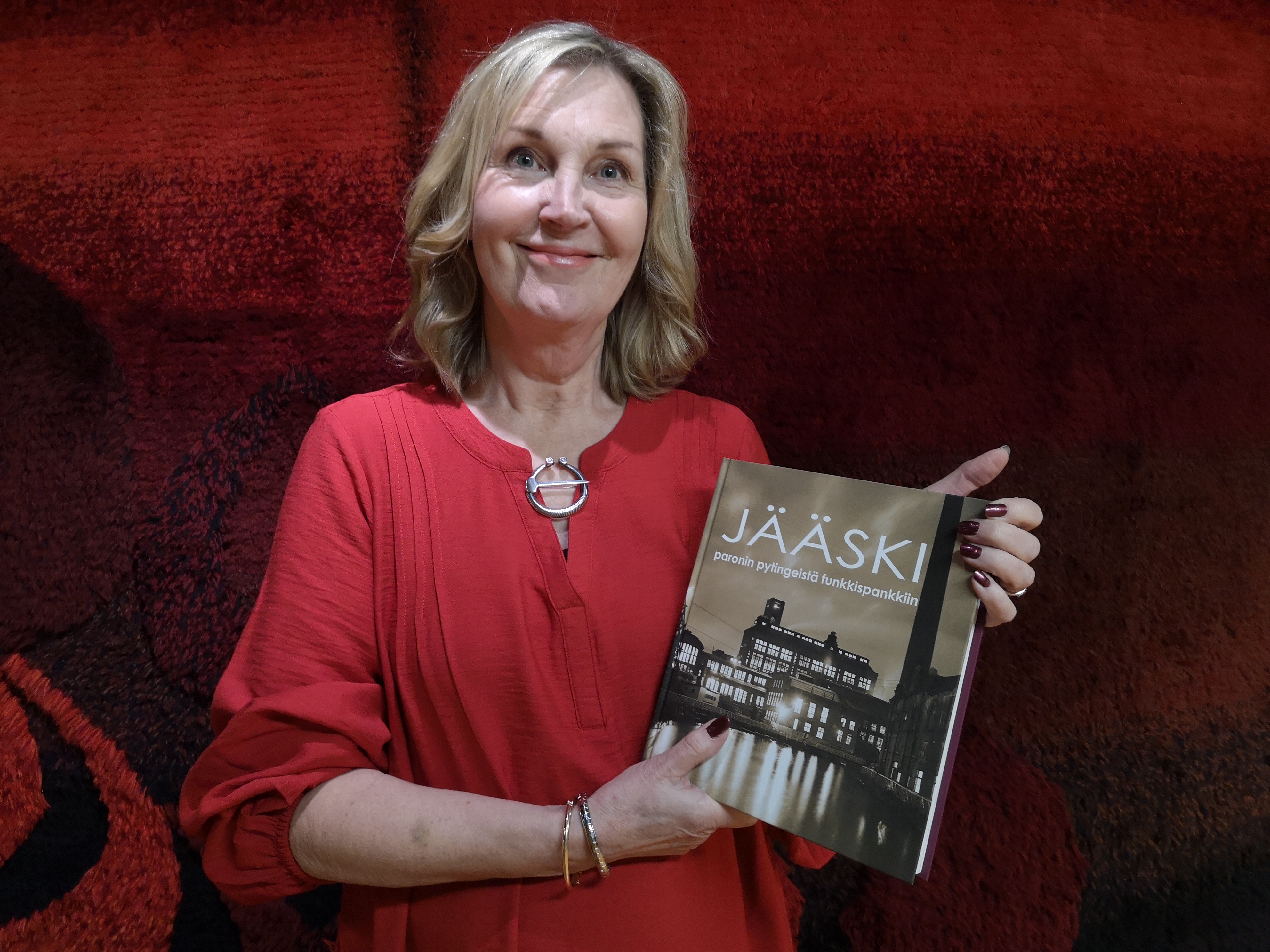 Jääski-seuran puheenjohtaja Kirsi Juuran toimittama Jääski paronin pytingeistä funkkispankkiin -kirja voitti Karjalan Liiton vuoden 2024 Pitäjä- ja kyläkirjakisan. Kuva: Mervi Piipponen.