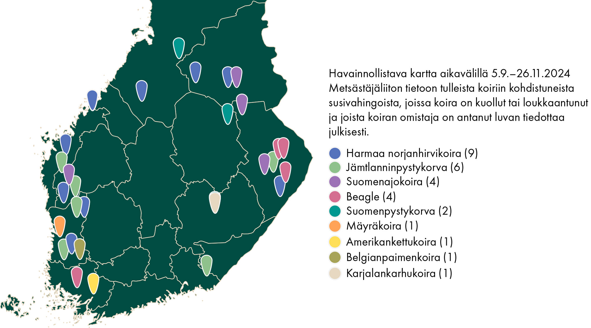 Aikavälillä 5.9.–26.11.2024 tiedotetuissa tapauksissa susivahingon kohteiksi joutuivat varsinkin harmaa norjanhirvikoirat ja jämtlanninpystykorvat. Myös useita suomenajokoiria ja beagleja on menetetty tai haavoittunut. Kolmannes tapauksista on sattunut harjoituksen aikana, yksi hirvenhaukkukokeessa. Yhdessä tapauksessa kaksi sutta kävi Puolustusvoimien koiran kimppuun ohjaajan kotipihalla. Tavallisimmin koira kuitenkin kohtasi suden metsästystilanteessa, useimmiten hirvijahdissa. Yhtä tapausta lukuun ottamatta tilanteissa kuoli tai haavoittui yksi koira tapausta kohden.