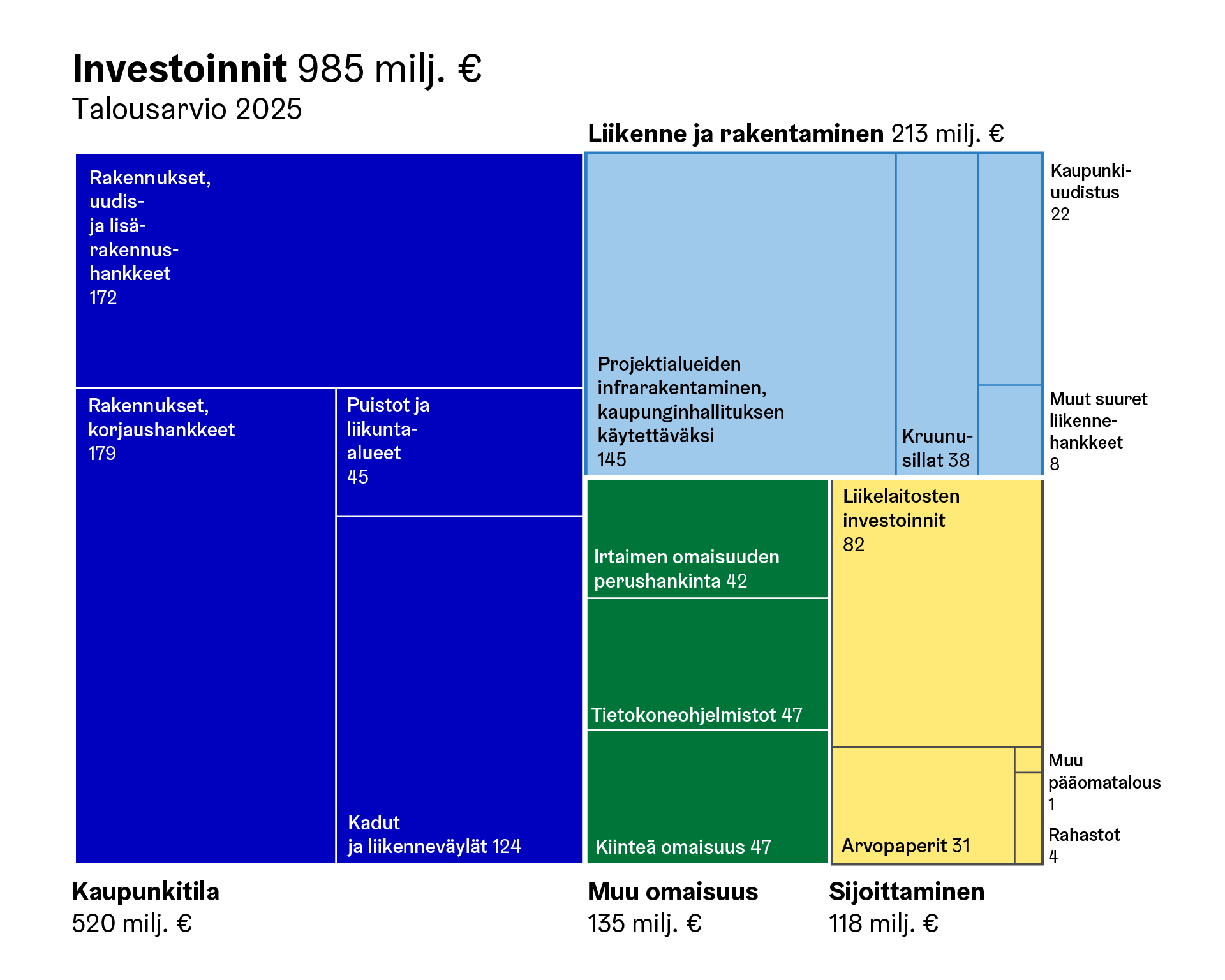 Helsingin kasvun edellyttämät investoinnit pysyvät edelleen korkealla tasolla. Vuonna 2025 kunta-Helsingin investoinnit ovat yhteensä 985 miljoonaa euroa. Investointiohjelman lähtökohtana on käynnissä olevien hankkeiden ja lakisääteisten palveluiden rahoituksen turvaaminen. Kunta-Helsinki tarkoittaa Helsingin kaupunkia ilman valtiorahoitteista sosiaali-, terveys- ja pelastustoimialaa.