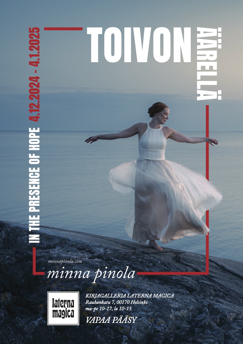 Minna Pinolan Toivon äärellä (In the Presence of Hope) -valokuvanäyttely esillä Helsingin keskustassa Laterna Magicassa, Rauhankatu 7, 4.12.2024 – 4.1.2025, avoinna ma-pe klo 10-17 ja la 10-15.