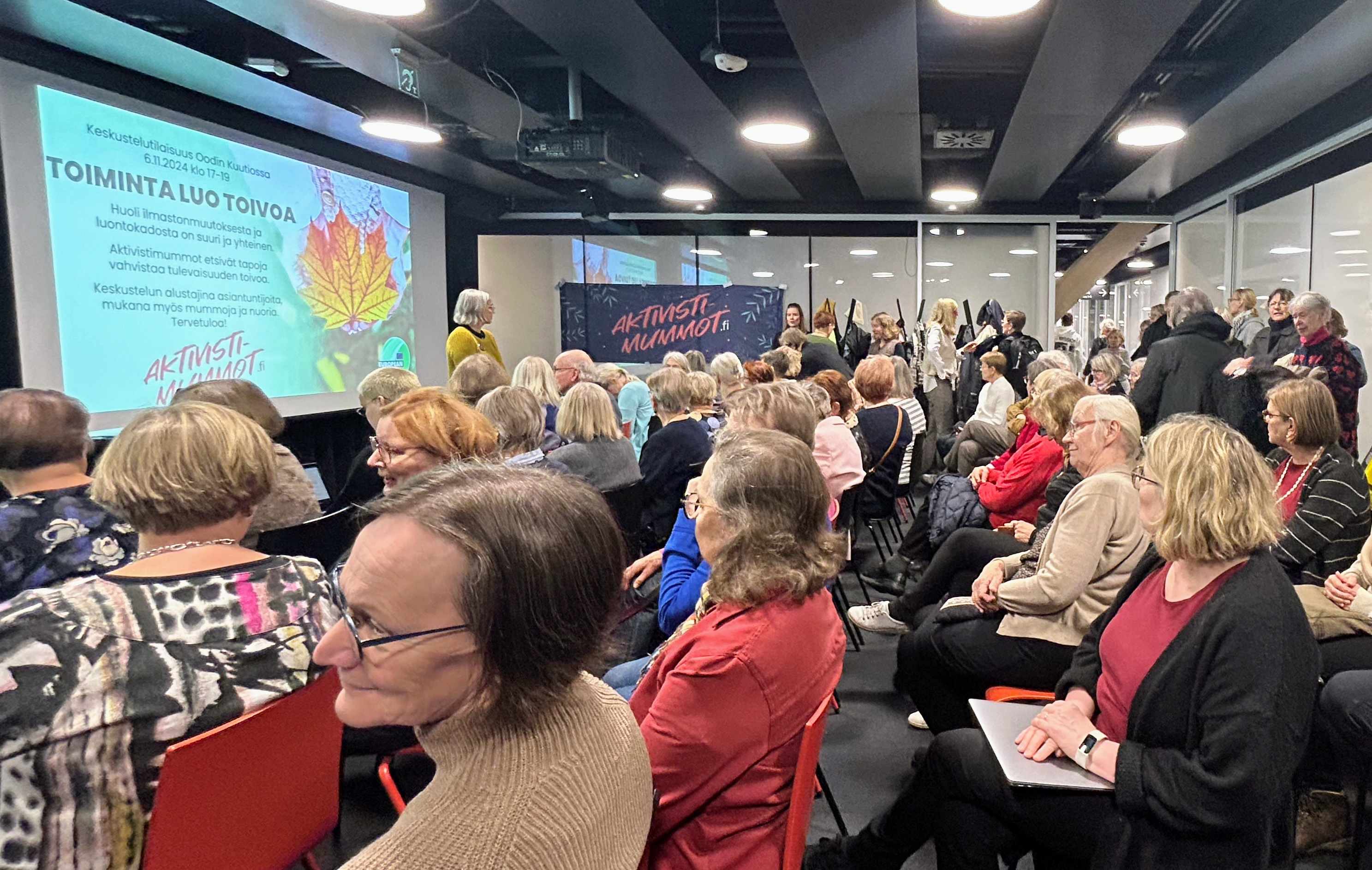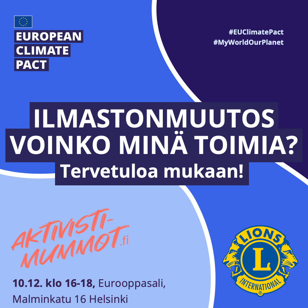 Aktivistimummot sekä helsinkiläiset Lions-aktiivit järjestävät avoimen ilmastokeskustelun Eurooppasalissa Helsingin Kampissa tiistaina 10.12.2024 klo 16–18. Tilaisuudessa tutustutaan tuoreeseen tutkimustietoon ja keskustellaan käytännön keinoista hidastaa ilmastonmuutosta ja sopeutua muuttuviin oloihin.