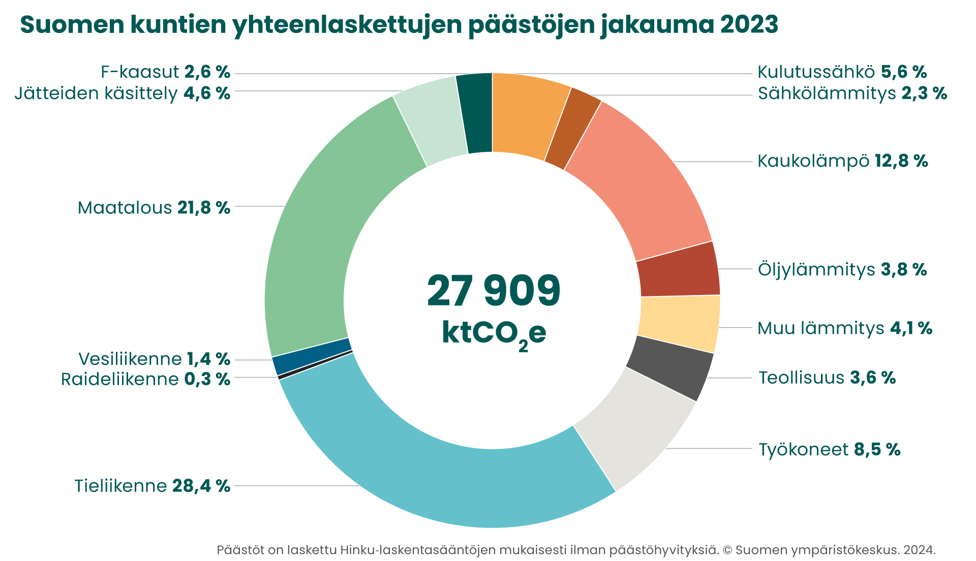 Suomen ympäristökeskuksen ennakkotiedon mukaan kuntien kasvihuonekaasupäästöt ovat laskeneet viime vuonna noin 9 prosenttia vuoteen 2022 verrattuna. Myönteinen kehitys johtuu pääosin energiasektorin eli sähkön- ja kaukolämmöntuotannon puhdistumisesta. Kulutussähkön päästöt pienenivät peräti noin 32 prosenttia ja sähkölämmityksen päästöt noin 35 prosenttia. Kaukolämmön päästöt laskivat noin 21 prosenttia.