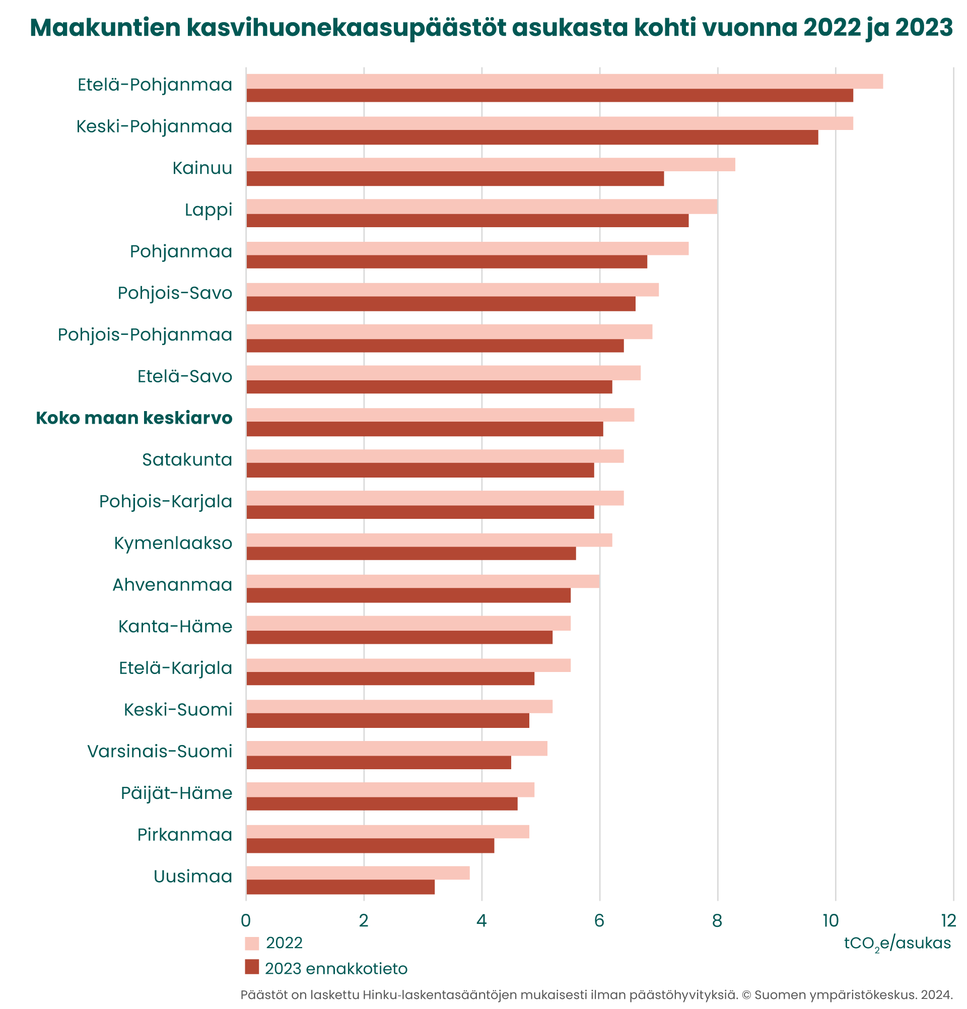 Ennakkotulosten mukaiset maakuntien kokonaispäästöt laskivat 5-15 prosenttia vuodesta 2022 vuoteen 2023, ja myös asukaskohtaiset päästöt olivat laskusuunnassa. Maakuntien päästövähennyksiä vauhditti energiasektorin tuotannon puhdistuminen ja erityisesti sähköntuotannon päästöjen vähentyminen.