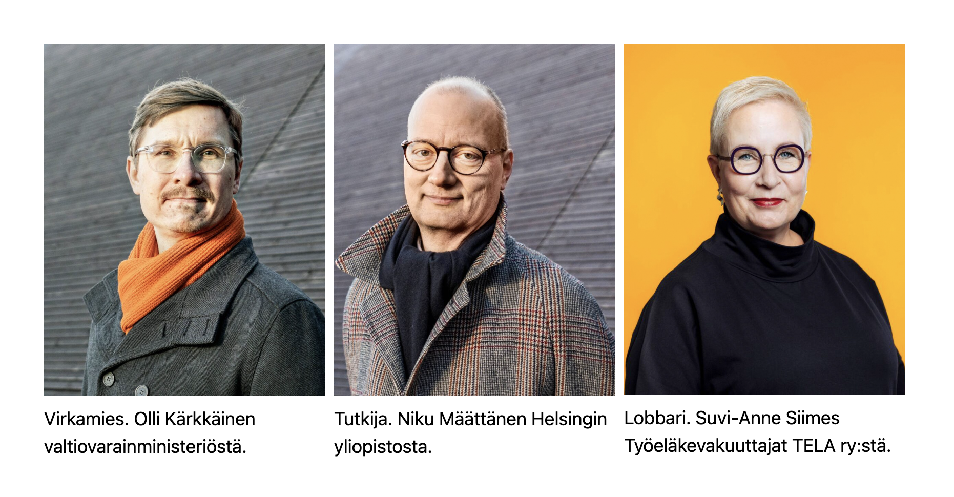 Työeläke-lehdessä mielipiteitä aiheesta kertovat Olli Kärkkäinen valtiovarainministeriöstä, Niku Määttänen Helsingin yliopistolta ja Suvi-Anne Siimes Työeläkevakuuttajat TELAsta.