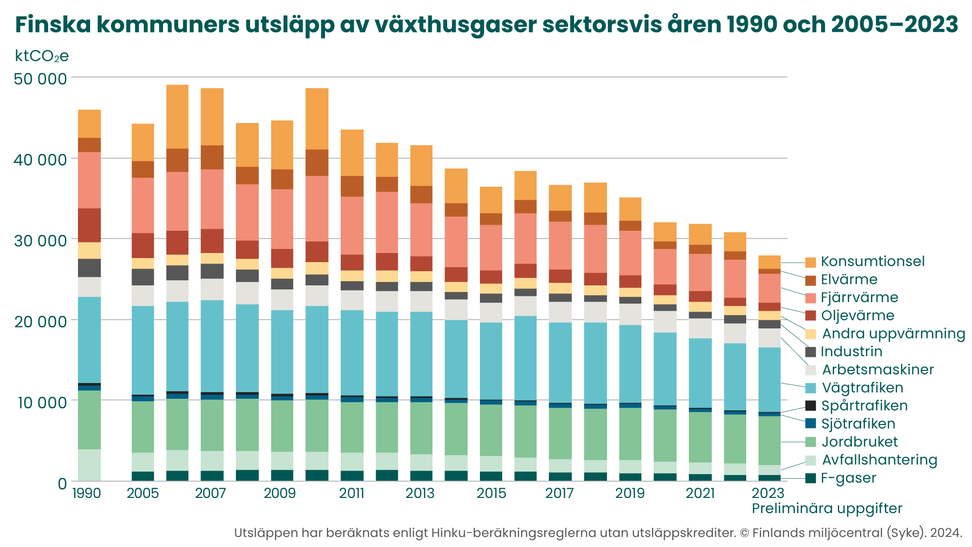 Enligt Finlands miljöcentrals förhandsbesked har kommunernas växthusgasutsläpp i fjol minskat med cirka 9 procent jämfört med år 2022. Den positiva utvecklingen beror huvudsakligen på att energisektorn, det vill säga el- och fjärrvärmeproduktionen har blivit renare. Utsläppen från användningen av konsumtionsel minskade emellertid med cirka 32 procent och utsläppen från eluppvärmning med cirka 35 procent. Utsläppen från användningen av fjärrvärme minskade med cirka 21 procent.