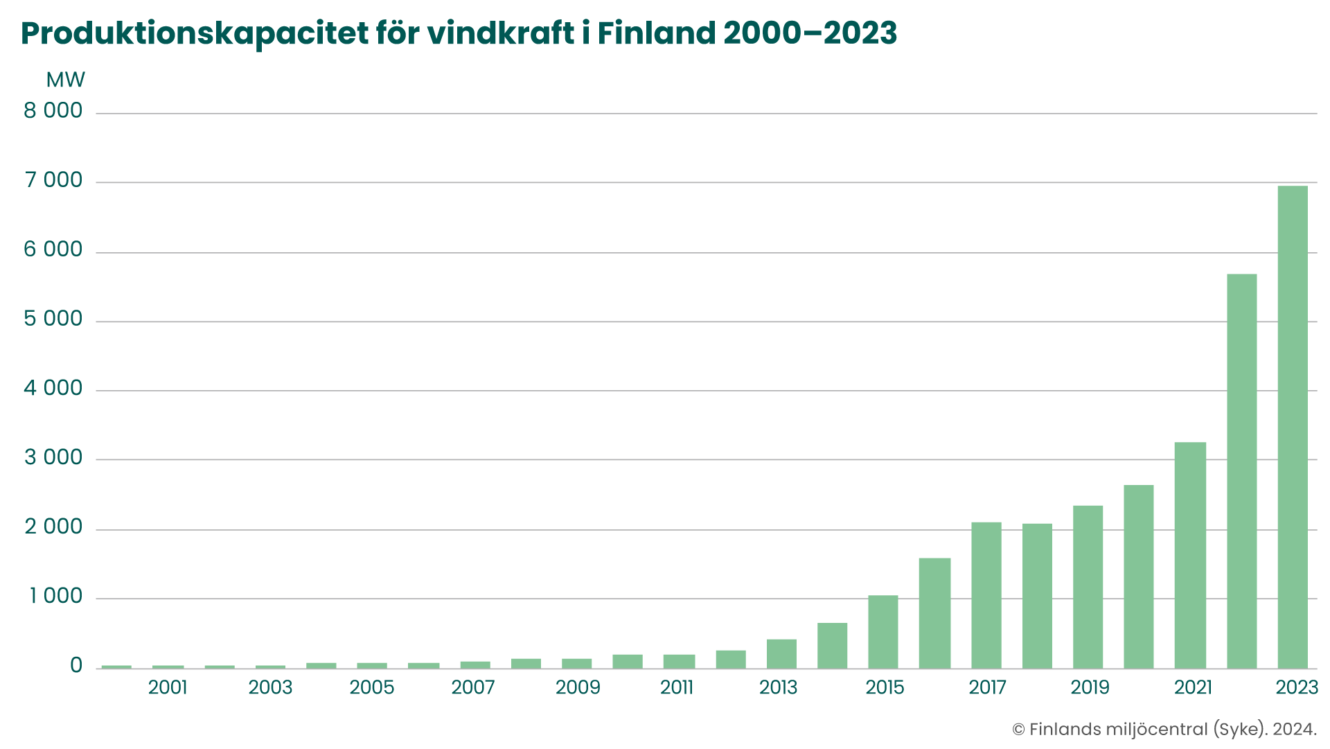 Inom energisektorn minskade användningen av stenkol och torv, vilket minskade utsläppen från användningen av fjärrvärme. Byggandet av vindkraft har särskilt efter år 2015 blivit snabbare i Finland. År 2023 ökade produktionskapaciteten för vindkraft med cirka 1 200 MW jämfört med år 2022 och den totala kapaciteten var cirka 7 000 MW. Dessutom ökade produktionen av kärnkraft till följd av att kraftverket Olkiluoto 3 togs i bruk. Tillsammans minskade dessa betydligt elproduktionens utsläppsintensitet i Finland.