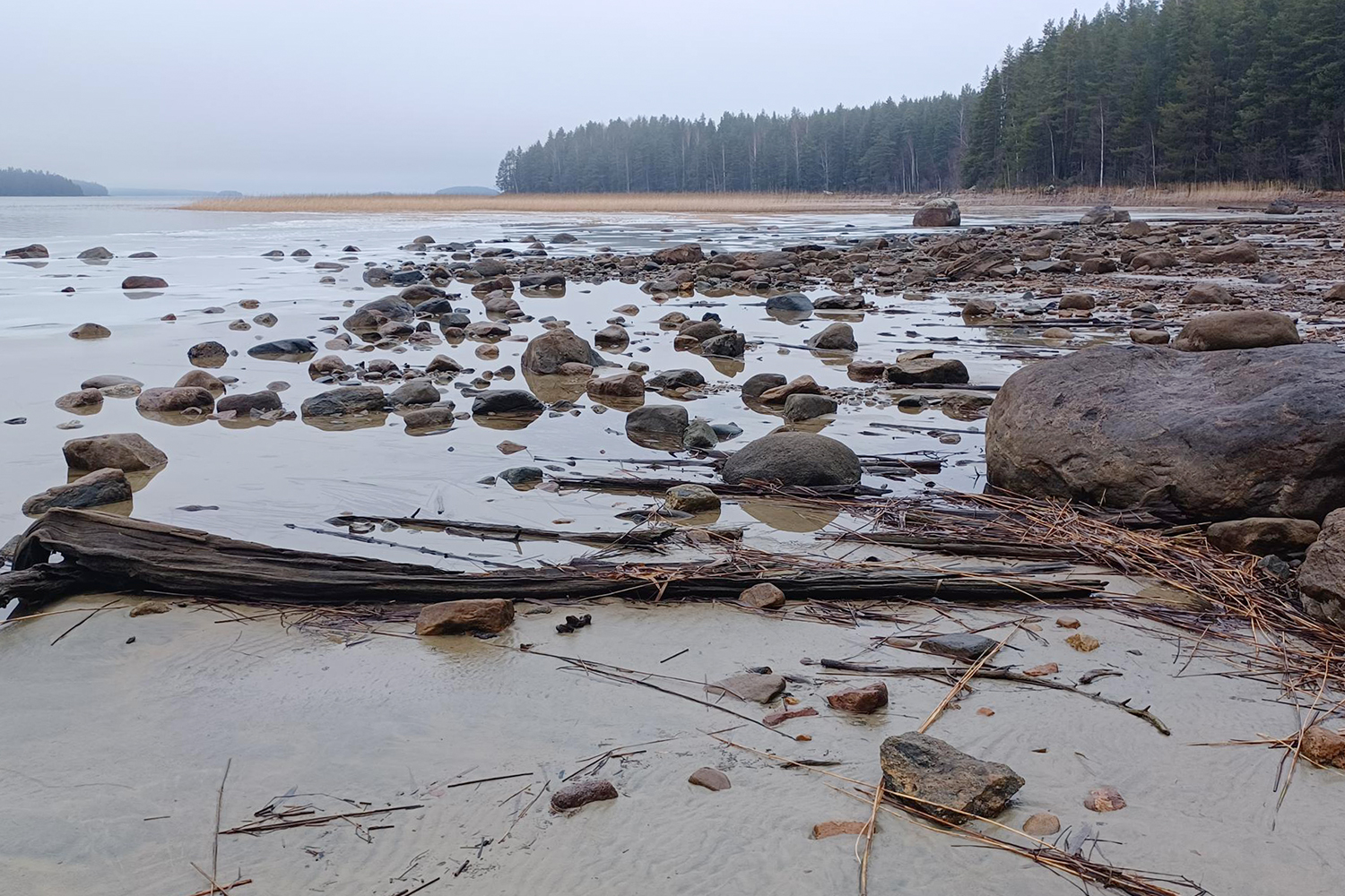 Pielisen vedenkorkeus oli torstaina 28.11.2024 1,43 metriä matalammalla verrattuna kevään 2024 tulvahuippuun. Kuva Laukkalansaaren edustalta. Kuva: Mika Pirinen / Pohjois-Karjalan ELY-keskus.