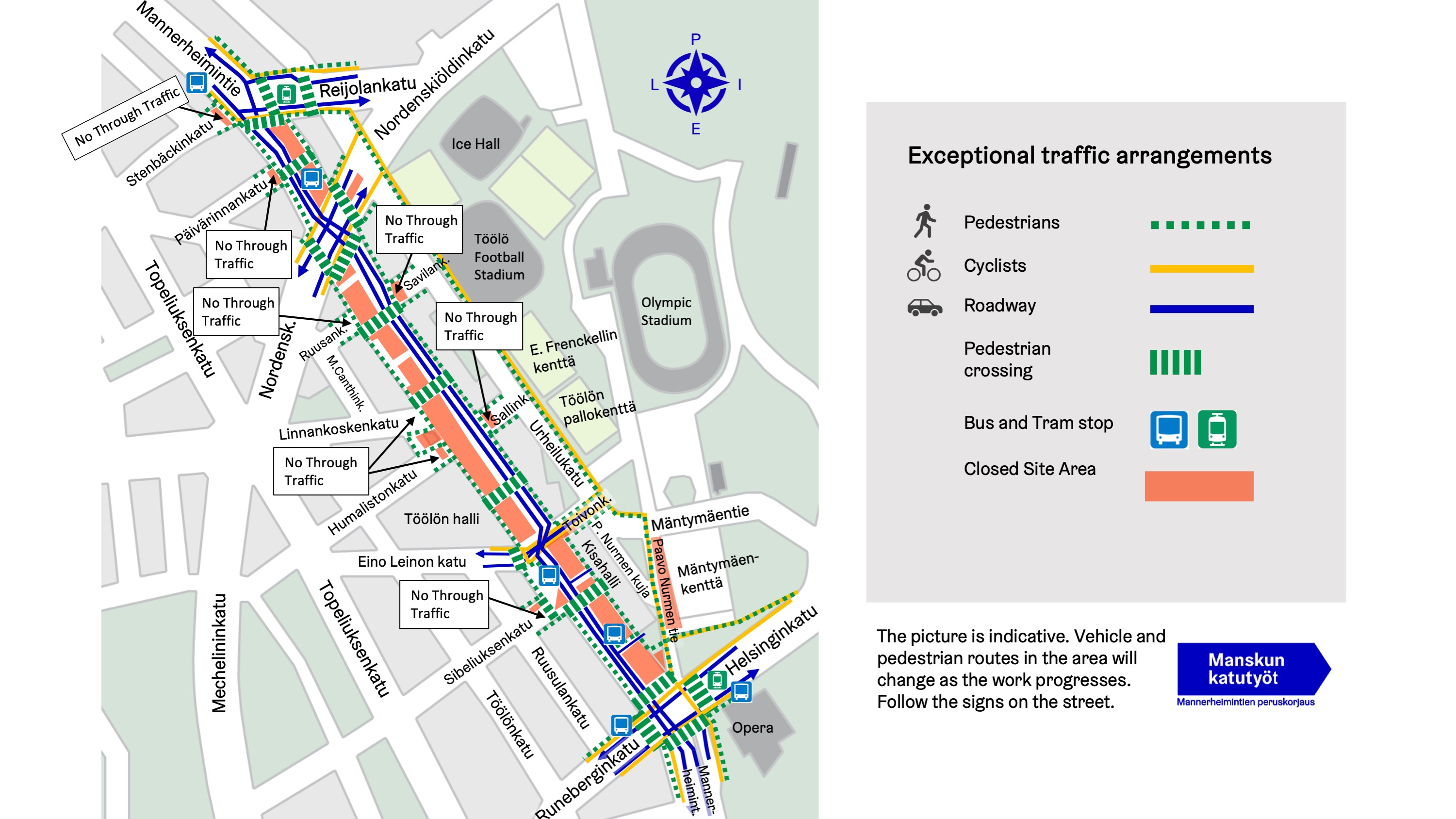 It is possible to drive through the Mannerheimintie construction site throughout the renovation, but alternative routes should be considered if possible. One lane in each direction will be available for motor vehicles during the renovation, but traffic may be congested. After the renovation, the driving lanes will be available as before.