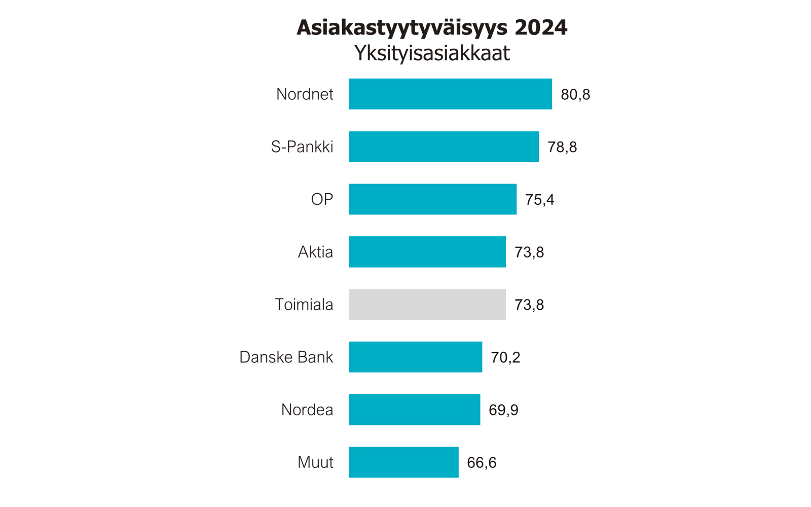 Säästäjät ja sijoittajat kokevat, että S-Pankki tarjoaa täyden palvelun pankeista parasta vastinetta rahoille. Tätä kuvaava indeksiarvo oli S-Pankilla 80,8 ja 5,3 indeksiyksikköä yli alan keskiarvon. Lisäksi S-Pankilla on alan toiseksi uskollisimmat asiakkaat: asiakasuskollisuutta kuvaava indeksiluku oli S-Pankilla 82,3, joka oli 5,7 indeksiyksikköä korkeampi kuin toimialan keskiarvo.