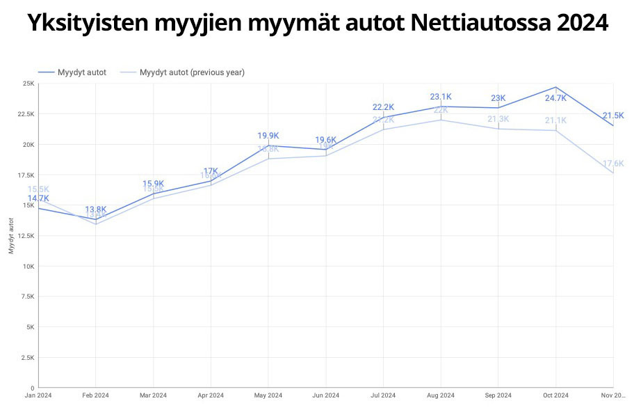 Nettiauton kautta ilmoitettuja autoja myytiin yksityisten henkilöiden välillä vuoden 2024 lokakuussa 17 % ja marraskuussa 22 % enemmän kuin viime vuonna samaan aikaan.