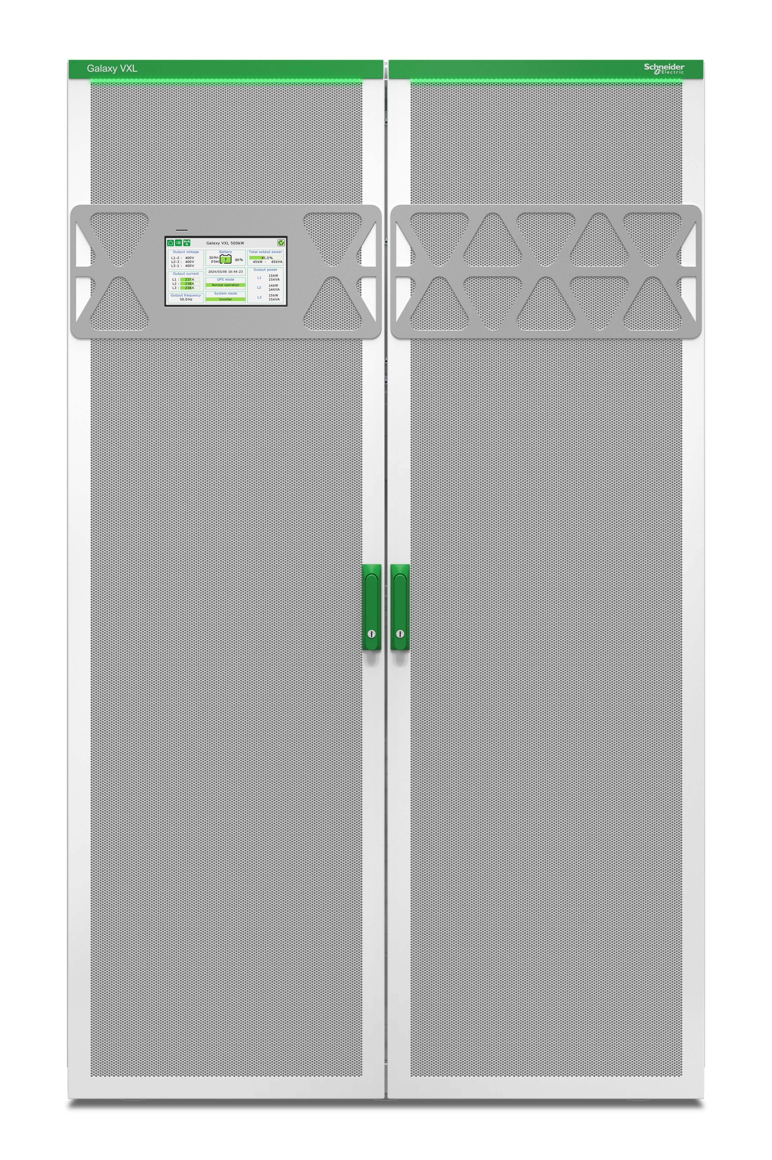 - Galaxy VXL pystyy syöttämään jopa 1,25 MW:n tehon yksittäisessä rungossa ja jopa 5 MW:n tehon, kun neljä yksikköä toimii rinnakkain. Samalla asiakkaiden kokonaiskustannukset (Total Cost of Ownership, TCO) minimoituvat huomattavasti paremman käyttö- ja energiatehokkuuden ansiosta.