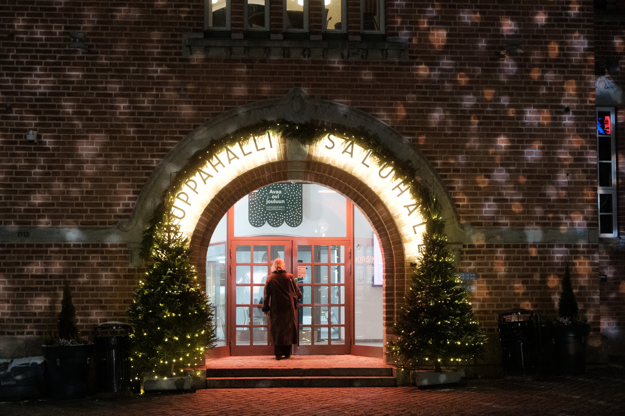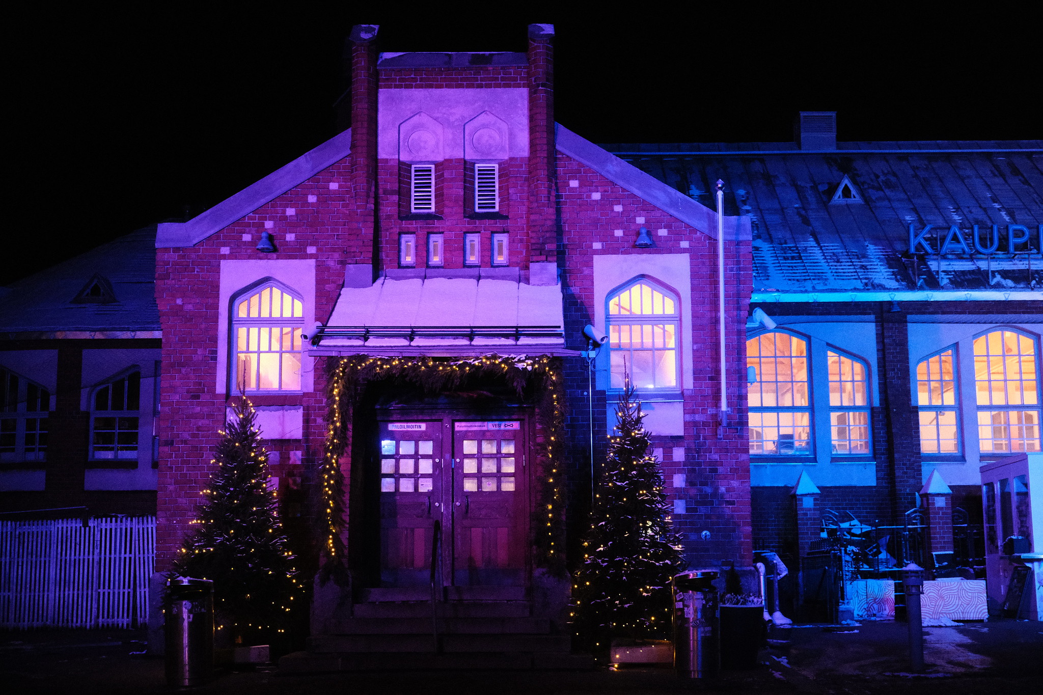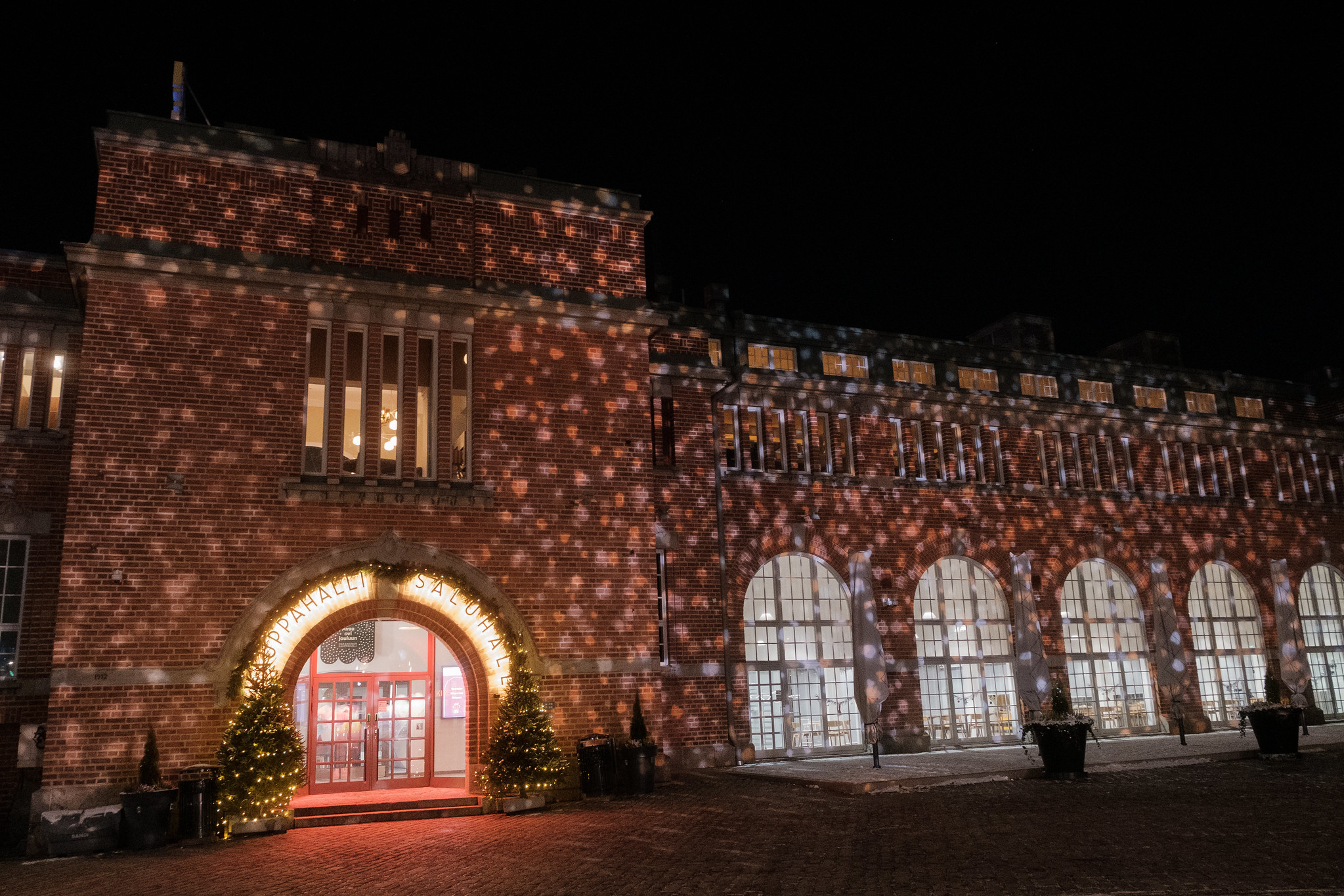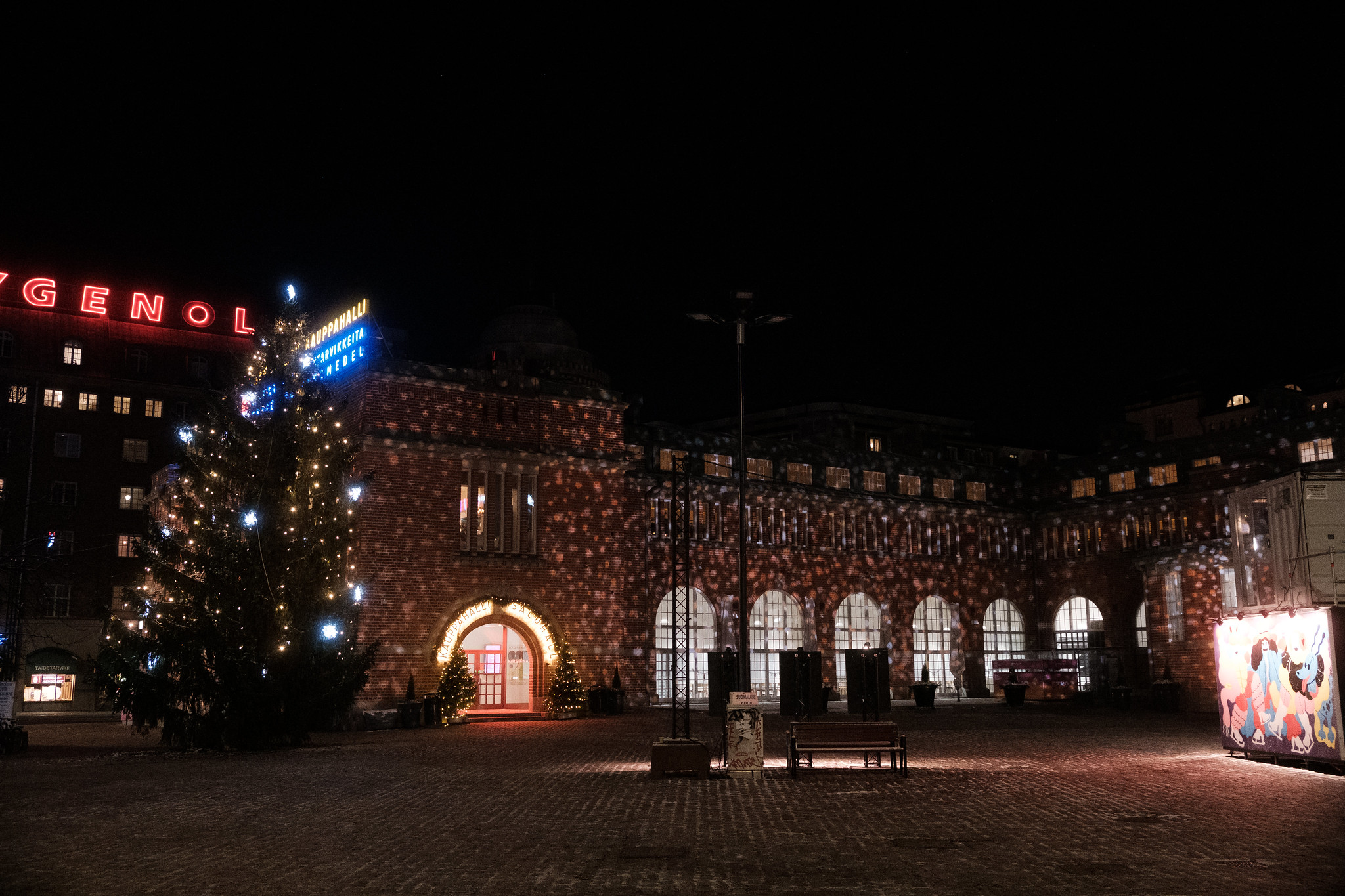 Hietalahden kauppahallin julkisivun ja piha-alueen on puolestaan valloittanut värikäs kausivalaistus, josta ei puutu iloa tai leikkimielisyyttä.