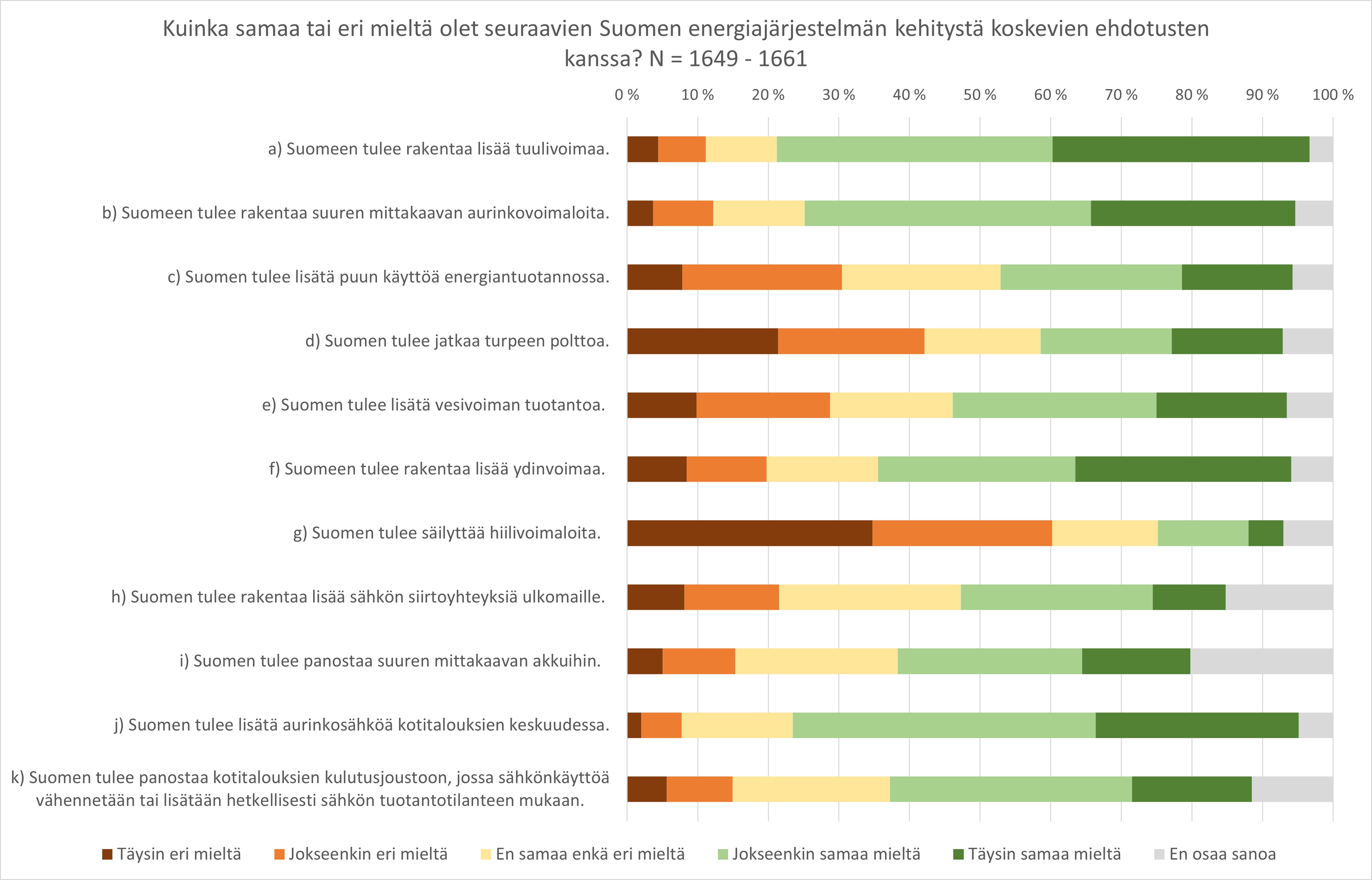 Eniten epätietoisuutta kansalaisilla on kansainvälisten siirtoyhteyksien lisäämiseen ja suuren mittakaavan varastointiteknologioihin. Noin 40 prosenttia vastasi kannattavansa panostuksia suuren mittakaavan akkuihin. Toisaalta neutraalien ja ”en osaa sanoa” -vastausten yhteenlaskettu osuus oli yhtä suuri.