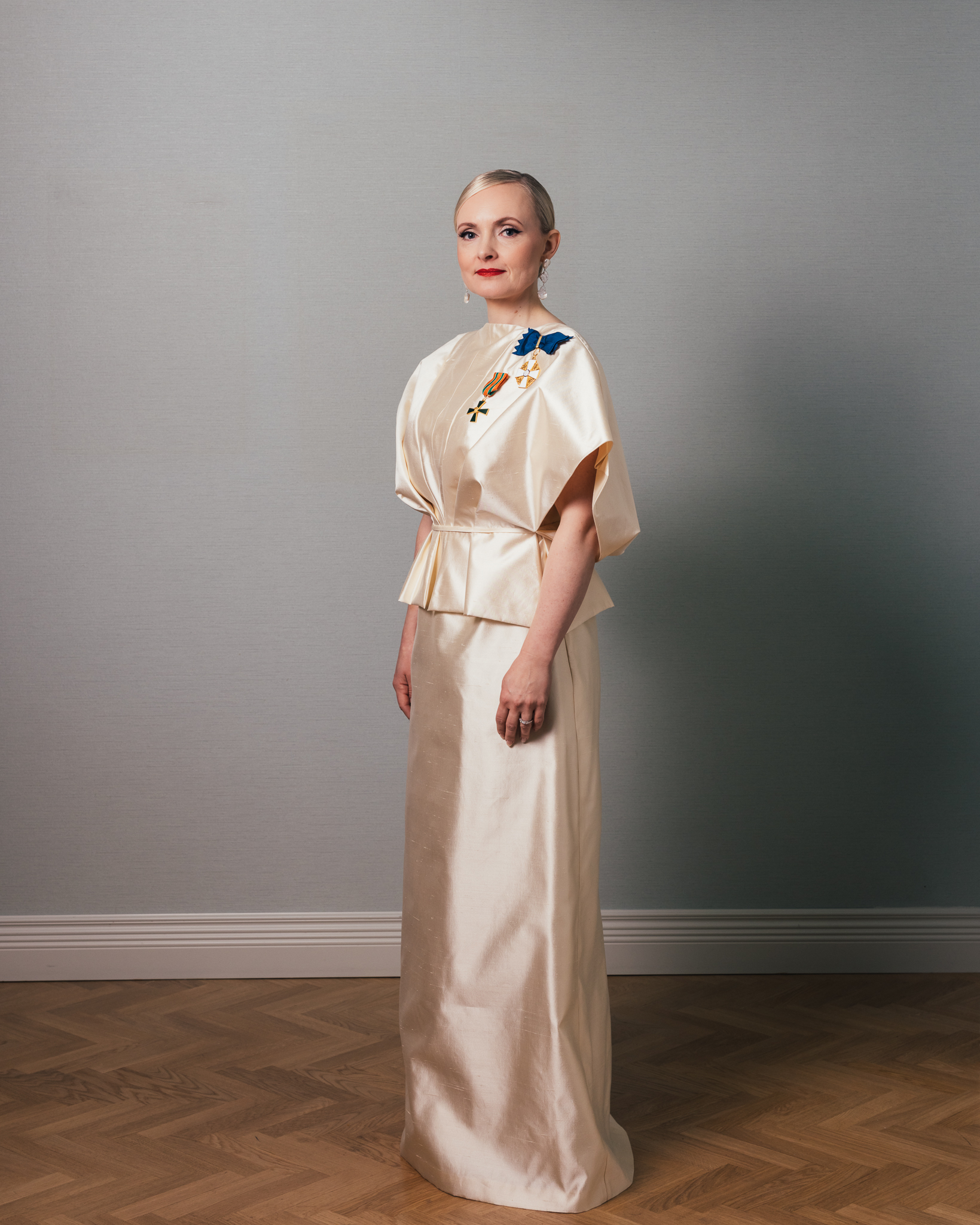 Europarlamentaarikko Maria Ohisalo astelee Linnan juhlaan paperimaista, japanihenkistä origami-estetiikkaa huokuvassa uniikissa luomuksessa. Muotisuunnittelija Anne-Mari Pahkalan suunnittelema luomus on valmistettu ylellisestä Shantung-silkistä. Asun on toteuttanut artesaani, suunnittelija-arkkitehti Ulla Vainikka.