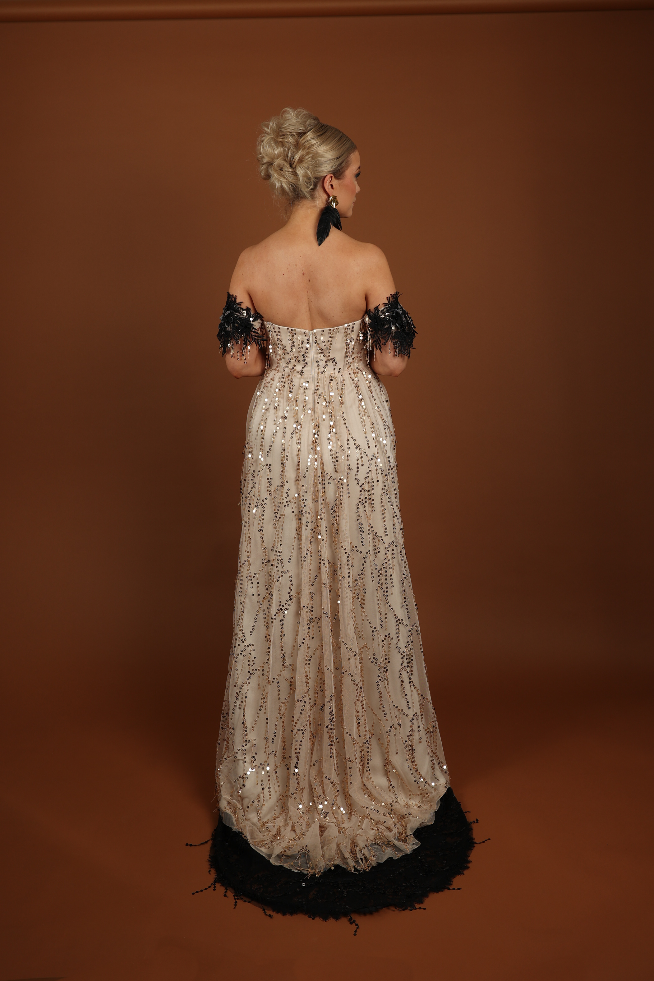 – Mekon ajatus lähti siitä, että Sofia toivoi voivansa käyttää uudelleen jonkin aiemmista mekoistaan ja samalla kantaa linnaan mukanaan naisiin kohdistuvan väkivallan teeman. Sofian puvun kultaisen kimalluksen ja siihen lisätyn mustan pitsilaahuksen kontrasti kuvastaa sitä, että vaikka ulospäin kaikki voi näyttää idylliseltä, kodin seinien sisäpuolella voi olla synkkää. Puvussa väkivallan synkkyyteen viittaavat mustat yksityiskohdat on sijoitettu mekon takaosiin symboloimaan sitä, että kamalista kokemuksista voi selvitä, vaikka niitä kantaakin mukanaan loppuelämänsä. Puvun kimallus puolestaan kuvastaa sitä, että elämä voi vielä väkivallasta selviämisen jälkeen tuoda paljon hyvää, Kuusjärvi kuvaa.