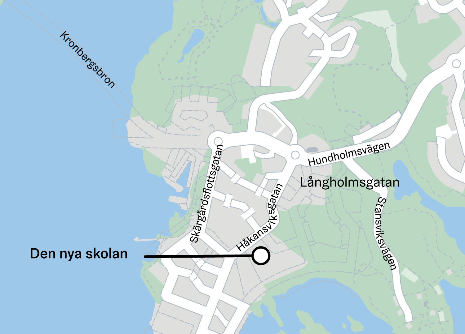 Den nya skolan på Kronbergsstranden byggs i servicekvarteret intill Långholmsgatan, som ligger på det tidigare oljehamnsfältet. Utöver en finsk- och svenskspråkig grundskola kommer servicekvarteret att inrymma ett nytt daghem och en lekpark samt lokaler för ungdomsarbete. Långholmsgatan har förbyggts under hösten 2024 med tanke på projektet.