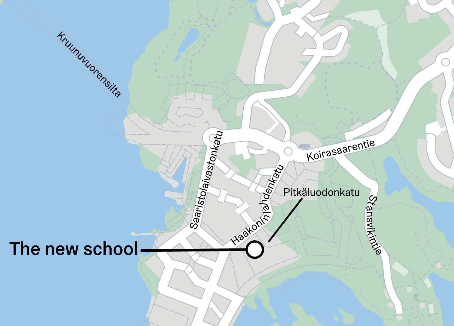 The new Kruunuvuorenranta school will be built in the service block on Pitkäluodonkatu, which is located in the grounds of the former oil port’s. In addition to a Finnish and Swedish comprehensive school, the service block will include a new daycare centre and playground, as well as youth work facilities. Initial construction has been carried out on Pitkäluodonkatu in autumn 2024 to prepare for the project.