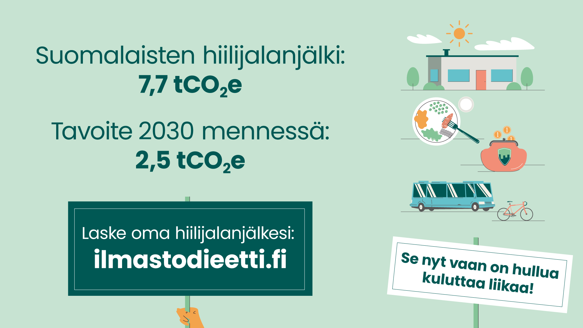 Kotitalouksien hiilijalanjälki on laskenut tuntuvasti 2000-luvulla noin 14 hiilidioksidiekvivalenttitonnista (CO2e) 7,7 tonniin. Syynä ei kuitenkaan ole suomalaisten kulutustottumusten muutos vaan tuotannon kasvihuonekaasupäästöjen väheneminen niin Suomessa kuin ulkomailla. Suomen ympäristökeskus on päivittänyt Ilmastodieetti.fi-työkalun, jolla kotitaloudet voivat laskea oman kulutuksensa hiilijalanjäljen.