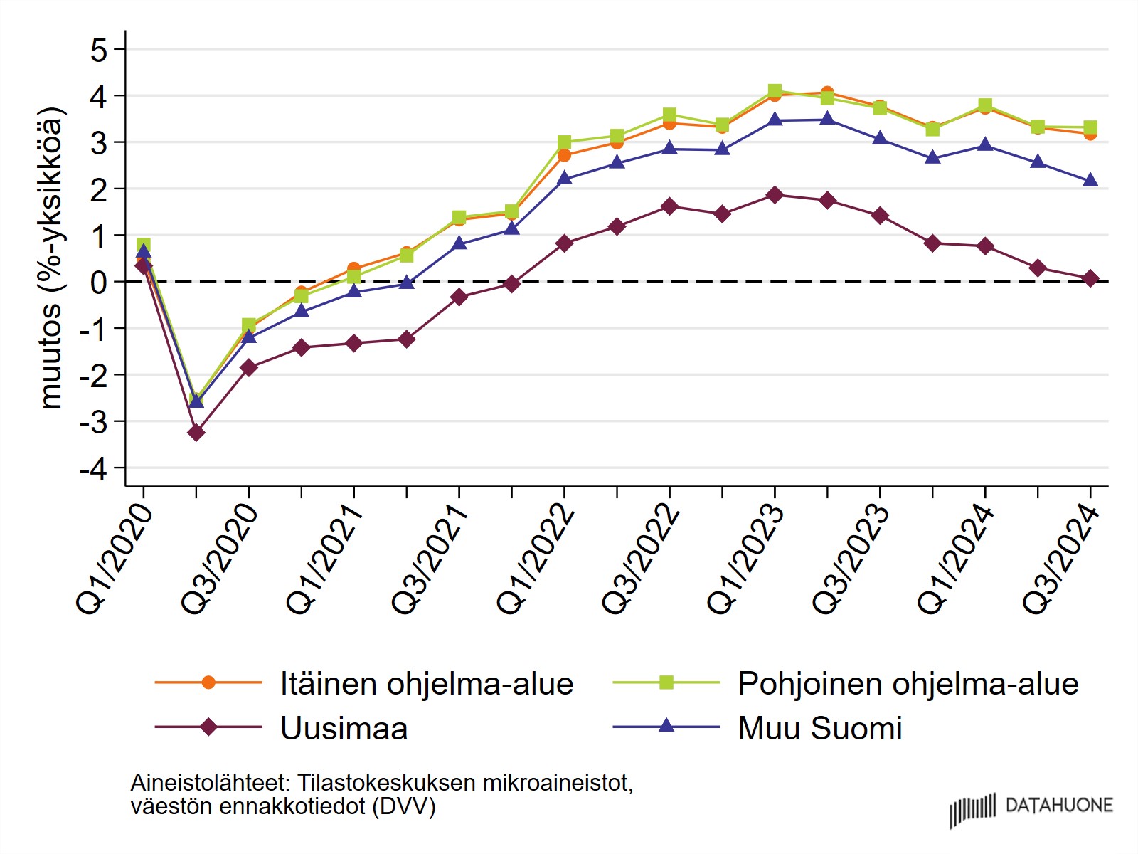Valtion taloudellisen tutkimuskeskuksen (VATT) Datahuoneen mukaan itäisen ja pohjoisen Suomen viimeaikainen kehitys ei eroa merkittävästi muusta Suomesta. Raportti Itäisen ja pohjoisen Suomen aluetaloudellinen kehitys (Datahuone-raportti 4/2024) on tehty työ- ja elinkeinoministeriön (TEM) toimeksiannosta. Selvitys tukee valtioneuvoston asettamien Pohjoisen ja Itäisen Suomen ohjelmien valmistelutyöryhmien työtä.