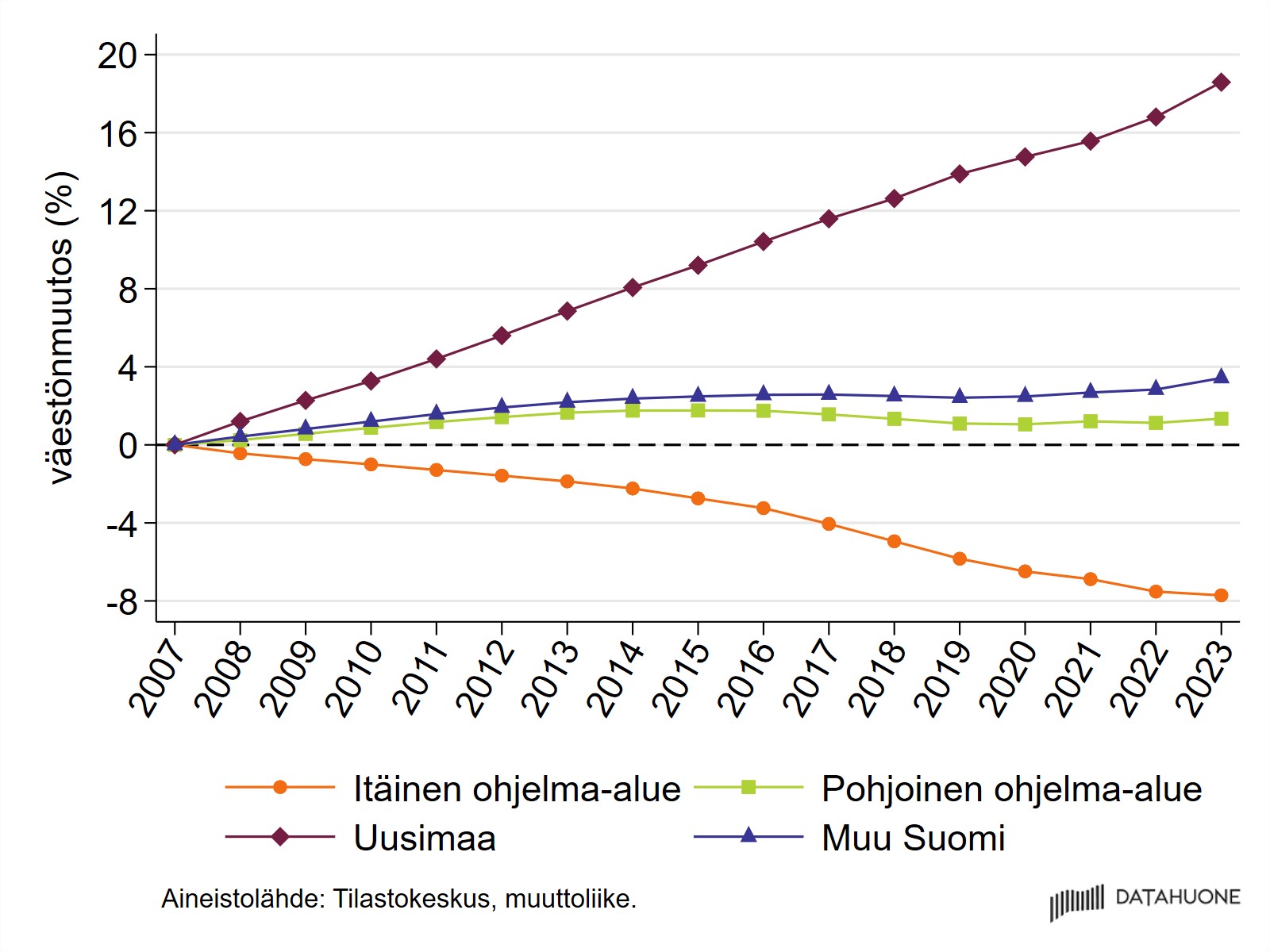 Itäisellä ohjelma-alueella väkiluku vähenee voimakkaasti, koska kuolevia on enemmän kuin syntyviä. Muuttoliikkeestä johtuva väestönmuutos on sen sijaan lähellä nollaa. Pohjoisella ohjelma-alueella muuhun maahan verrattuna korkea syntyvyys on kannatellut väestönkehitystä, mutta sielläkin luonnollinen väestönmuutos on kääntynyt negatiiviseksi.