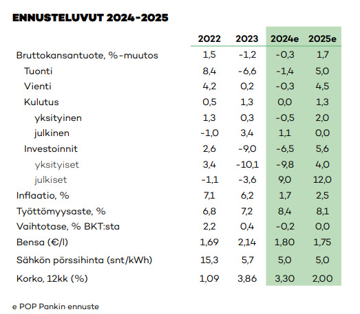 POP Pankin ennusteen avainluvut: BKT kasvaa tänä vuonna prosentin nousten ensi vuonna 1,4 prosenttiin yksityisen kulutuksen ja investointien vetämänä. Vuonna 2025 investointien ennakoidaan kasvavan 2 prosenttia, ja ensi vuonna 5,9 prosenttia. Inflaatio on tänä vuonna prosentin luokkaa sen kiihtyessä ensi vuonna 1,5 prosenttiin, kun talouskasvu elpyy ja korkojen lasku tasaantuu. Tuonnin kasvu kääntyy pitkän laskukauden jälkeen hivenen plussalle 0,3 prosenttiin ja ensi vuonna ollaan jo 4 prosentin kasvussa. Vienti puolestaan kasvaa tänä vuonna 1,7 prosenttia kiihtyen ensi vuonna kolmeen prosenttiin. 12 kuukauden Euriborin asettunee tänä vuonna keskimäärin 2,2 prosenttiin ja ensi vuonna 2,4 prosenttiin. Bensan hinta on keskimäärin tänä vuonna noin 1,70 euroa/litra nousten ensi vuonna maltilliset viitisen senttiä. Yksityisen kulutuksen ennakoidaan piristyvän tänä vuonna 0,8 prosentin kasvuun ja vuonna 2026 kasvun vauhdittuvan 1,3 prosenttiin. Luottamuksen vahvistuessa kulutus voi elpyä nop